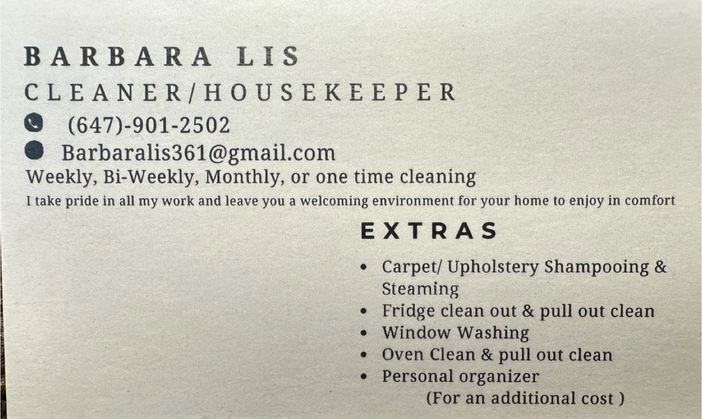 Business card for Barbara Lis, offering professional cleaning and housekeeping services. Services include weekly, bi-weekly, monthly, or one-time cleanings. Additional services like carpet shampooing, steaming, fridge cleaning, window washing, and oven cleaning are available for an extra cost. Personal organizing services are also offered.