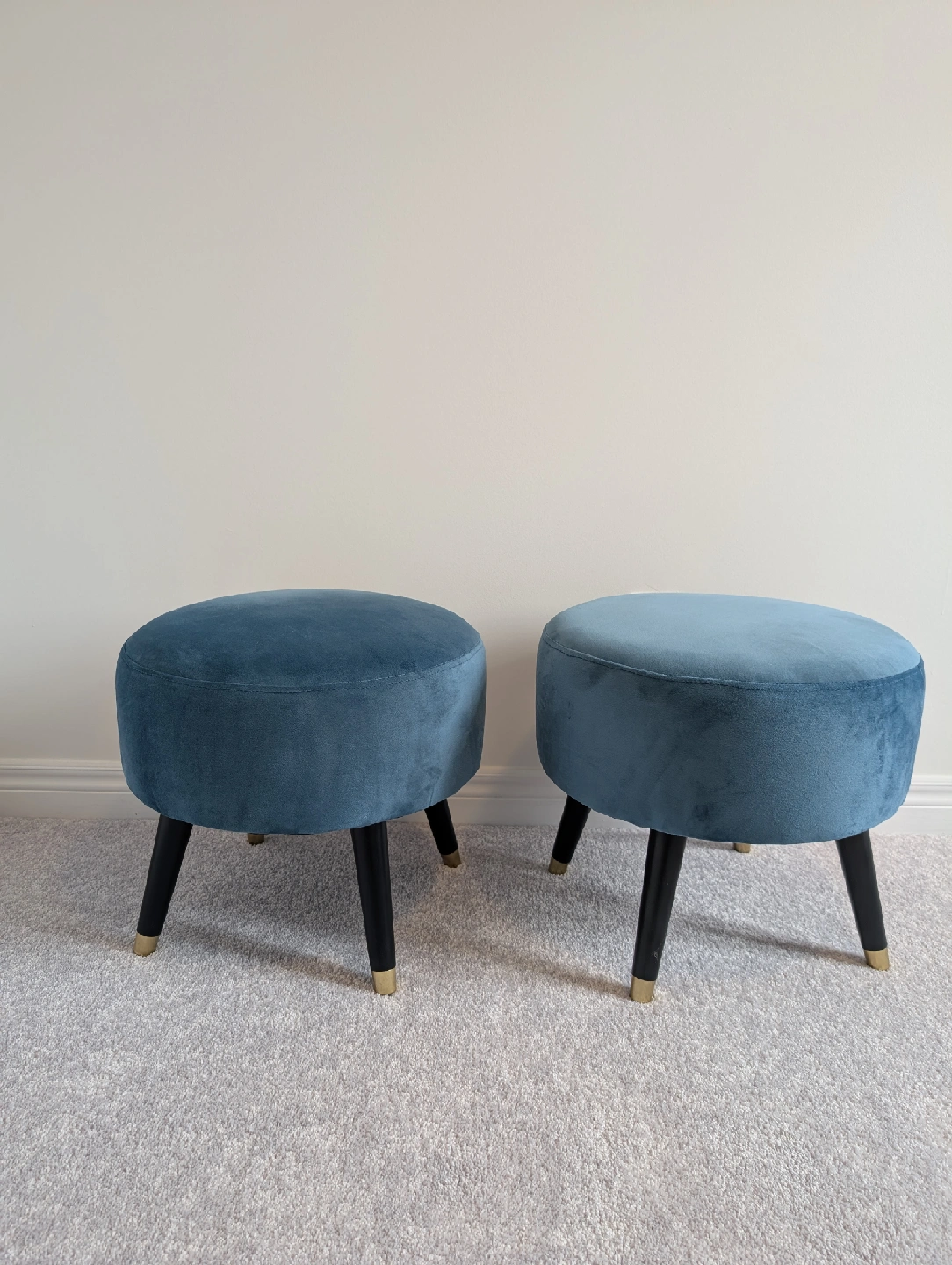 Selling a set of two round ottomans from structube. They feature a soft blue velvet upholstery and sleek black legs with gold accents. They have been kept in excellent condition like new in a smoke free home.