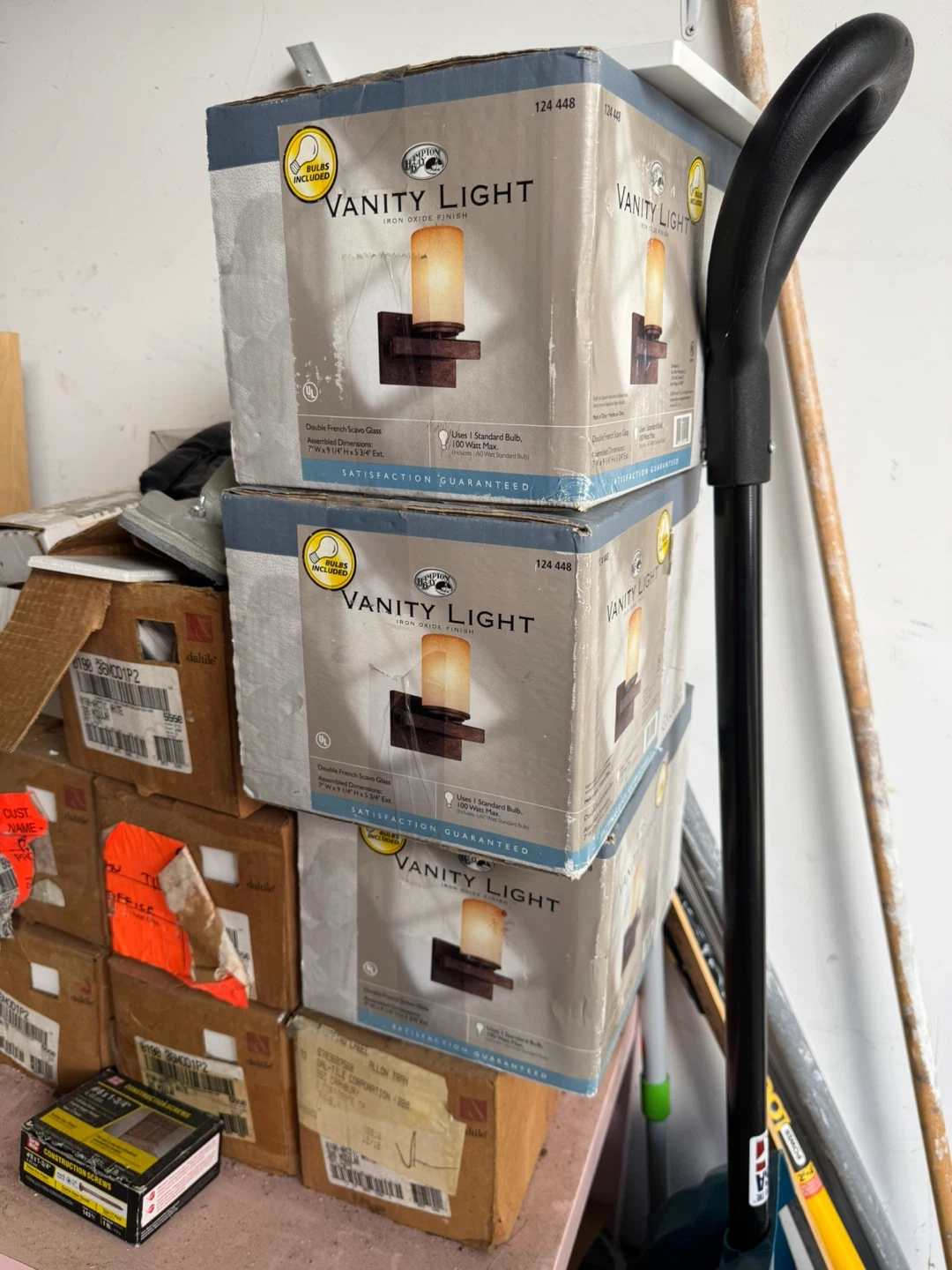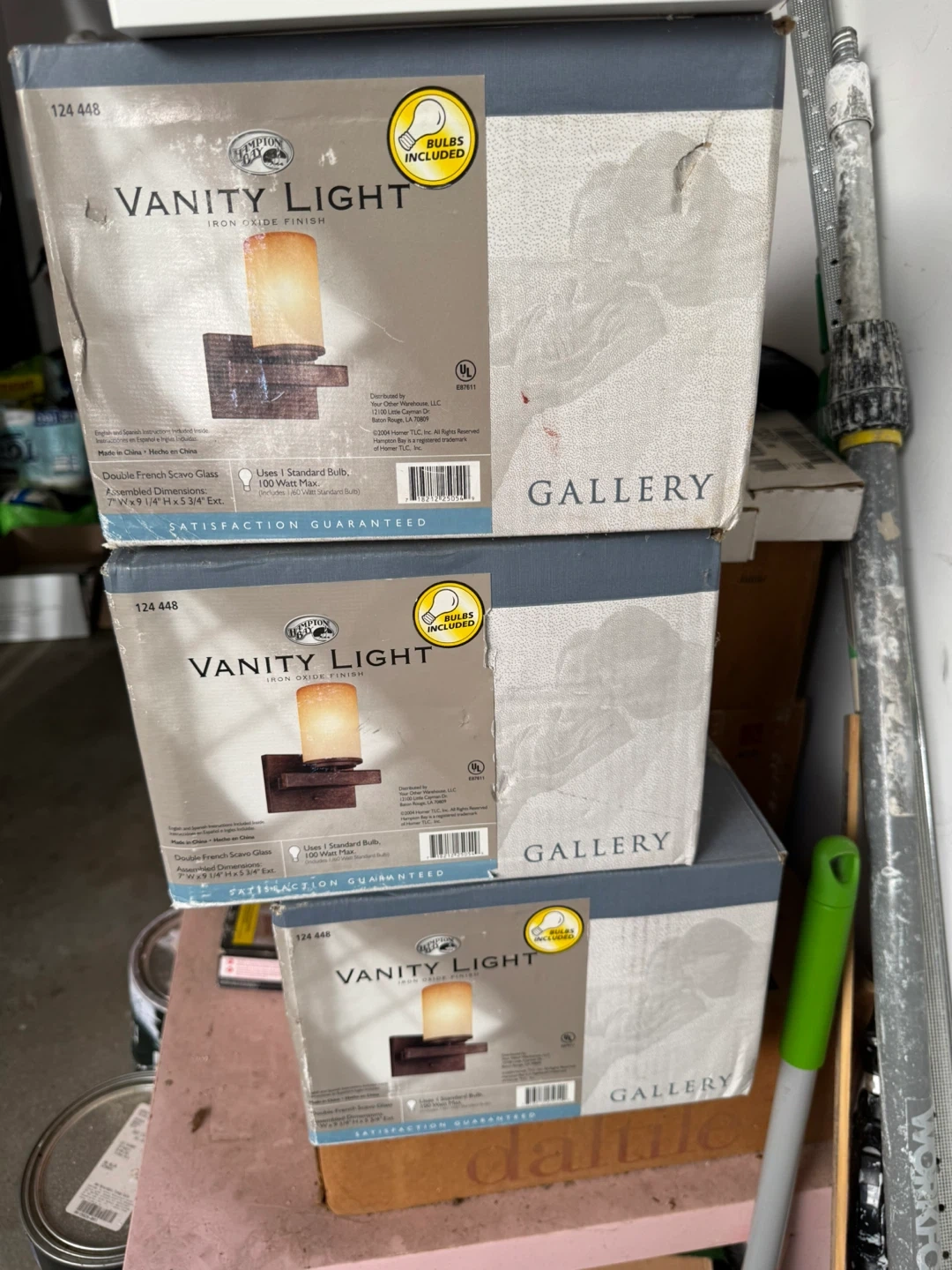 Selling 3 x Hampton Bay Vanity Lights with an iron oxide finish. Package includes the bulbs and feature double-french screen glass. It uses one standard bulb, 100 watt max. The assembled dimensions are 7"x5.5"x9.5". $15 a piece.