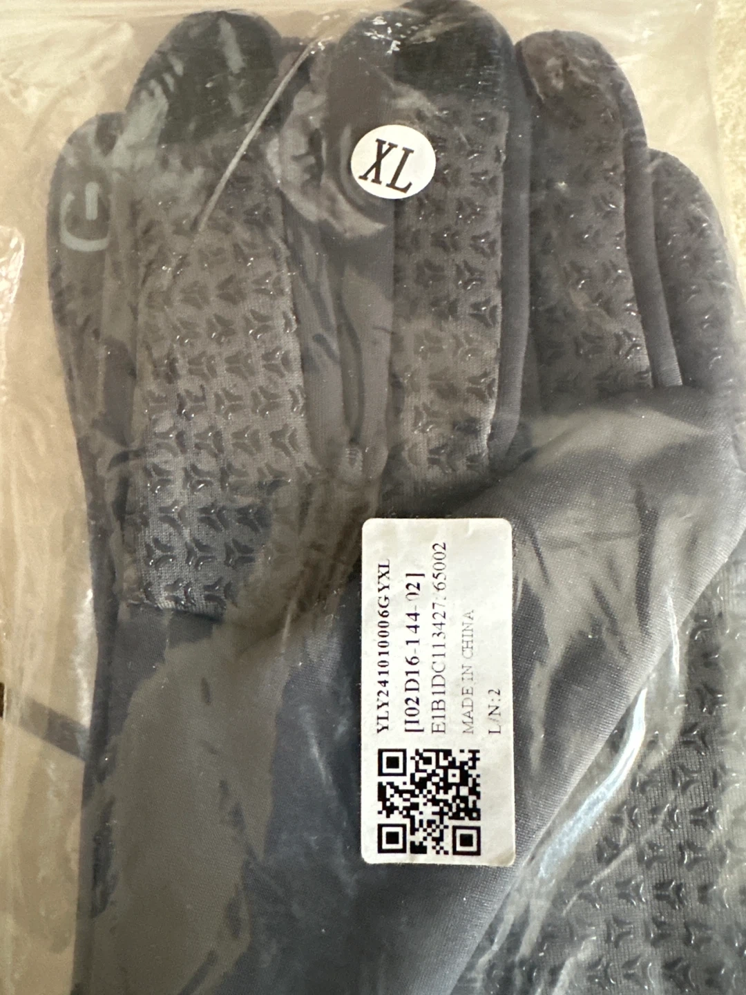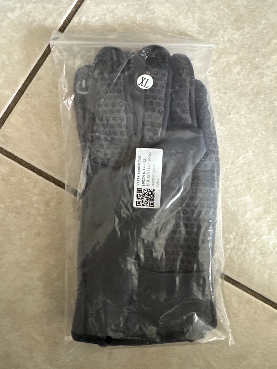 Warm winter gloves in black, size XL. They feature grip dots on the palms for better handling. Made in China.