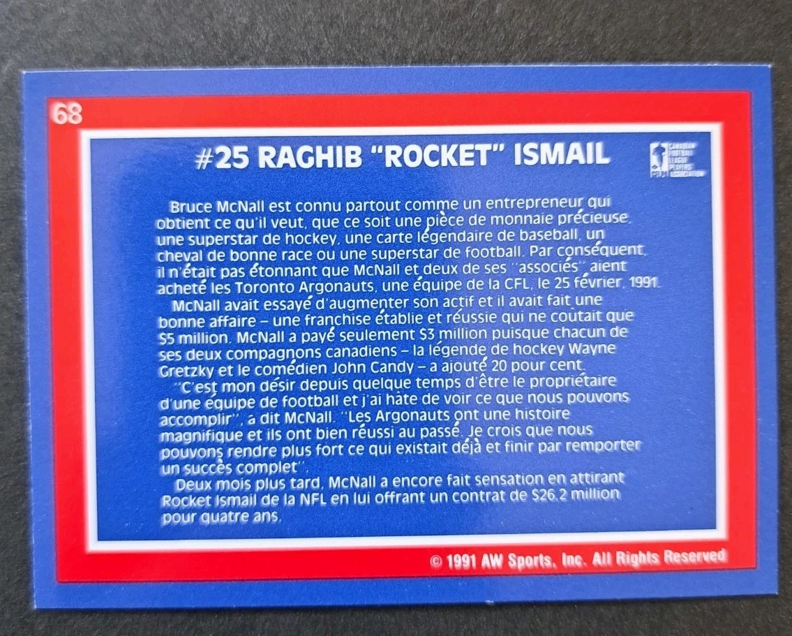Buy & SellRaghib Rocket Ismail - 1991 CFL Toronto Argonauts Card # 68Raghib Rocket Ismail - 1991 CFL Toronto Argonauts Card # 68$5This is an ungraded 1991 CFL Toronto Argonauts trading card featuring Raghib "Rocket" Ismail, card number 68. The card is in Near Mint or better condition.WHERE TO MEETCheck LocationView MapSELLERverifiedJosephUptown1194 reviews0 chats·0 favorites·4 viewsSEND CHAT TO SELLERHi Joseph! I’m interested in your listing.Hi Joseph! I’m interested in your listing.Get the Karrot app to chatSign In to chat