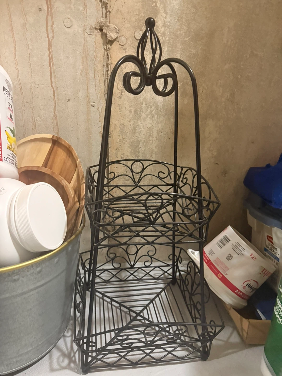 This decorative two-tier metal wire basket is perfect for storing fruits or vegetables. Its black wrought iron design adds a touch of elegance to any kitchen. Use it to keep your produce organized and accessible!