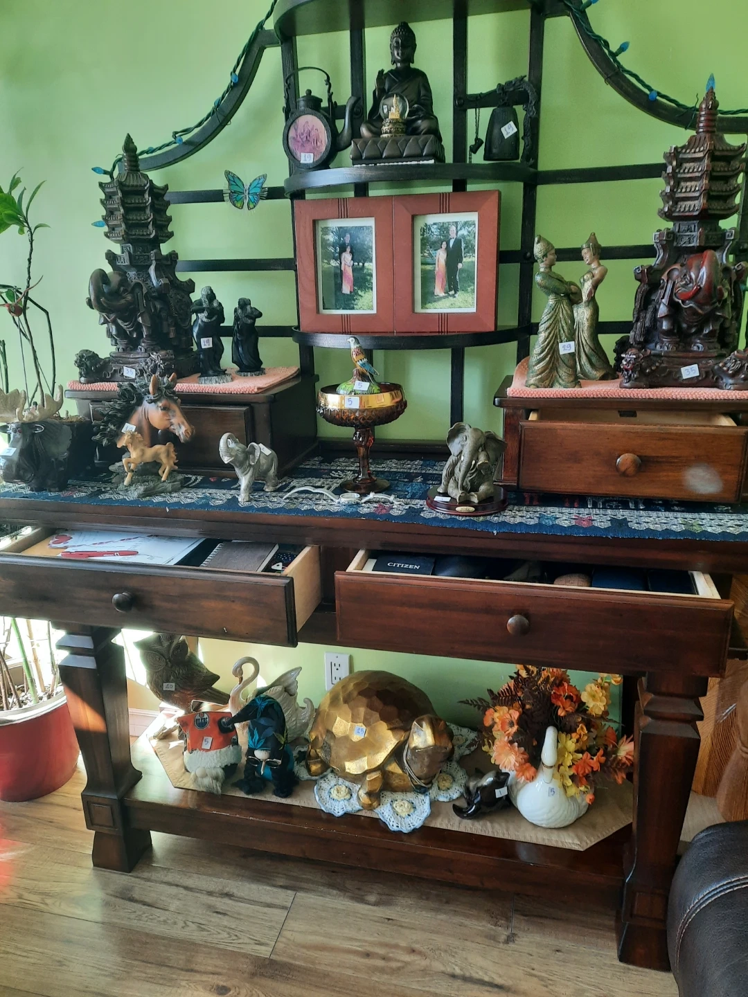 A sturdy wooden display cabinet featuring two spacious drawers. It's perfect for entryways or living spaces needing extra storage. This table offers a classic design that complements various decor styles. If interested in, we can set up a time and date for checking out. In Beverly Heights. $ 200 Cash only .
