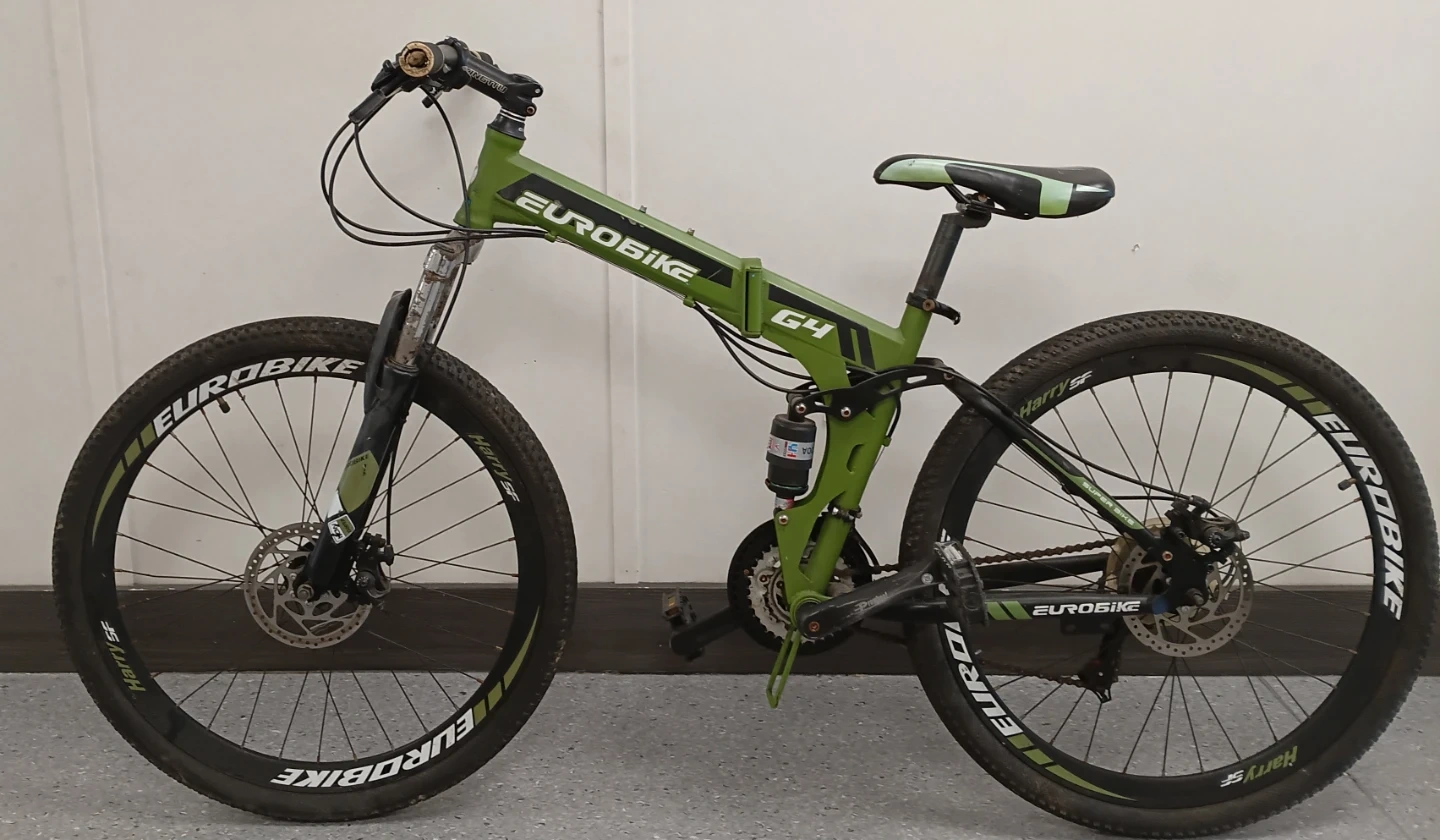 This is a green Eurobike G4 folding mountain bike. It features disc brakes and suspension. It's a versatile bike for various terrains. OPEN OFFERS