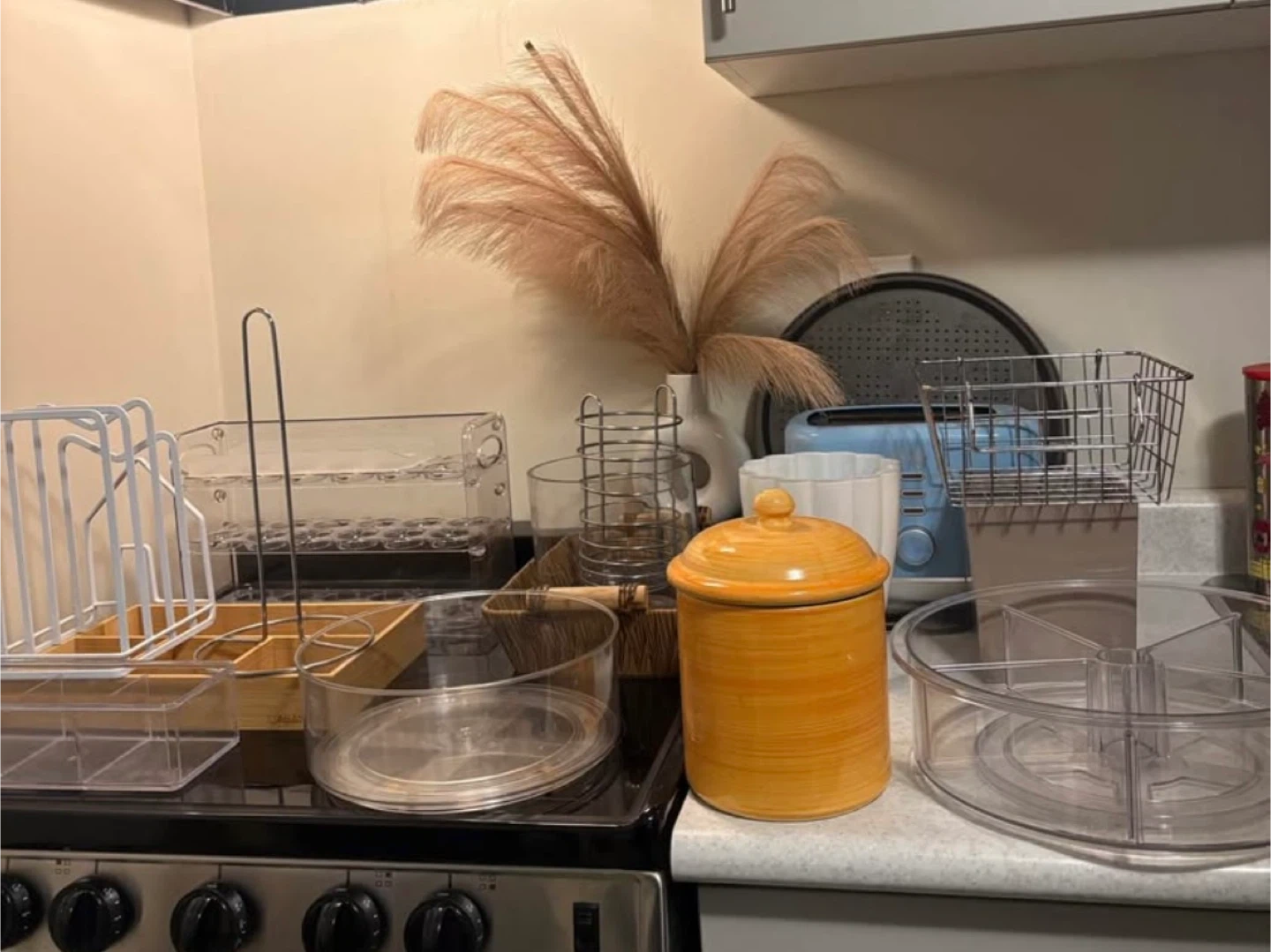 You'll find a turntable organizer, a canister, a dish drying rack, and other storage solutions. They're perfect for decluttering your countertops and drawers.