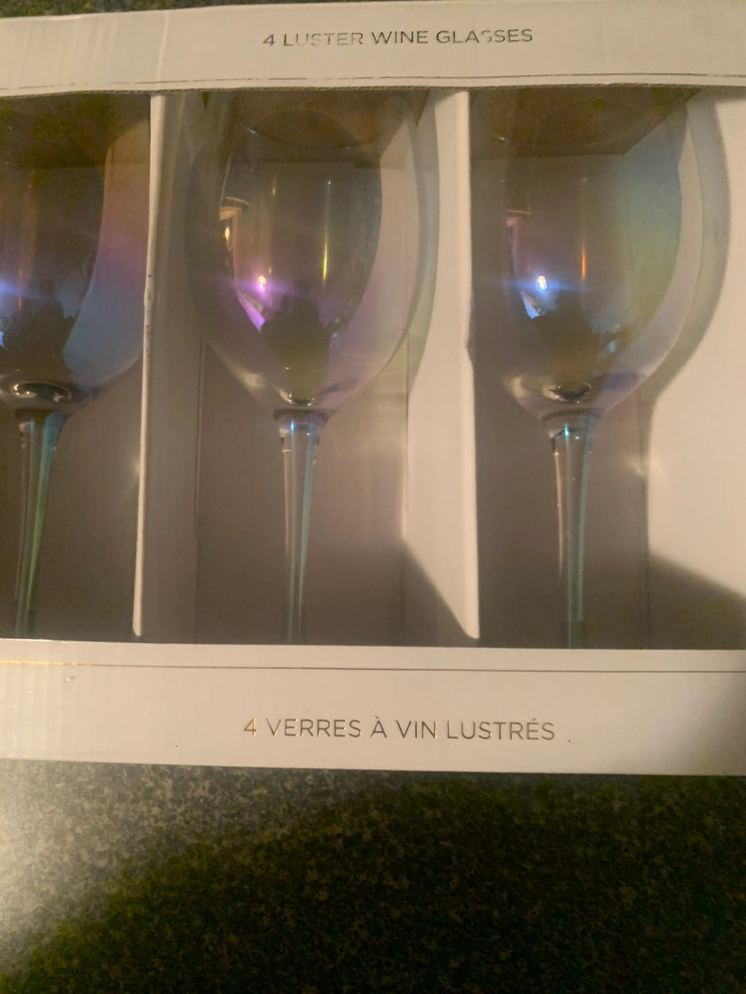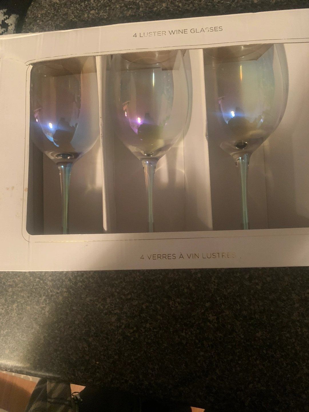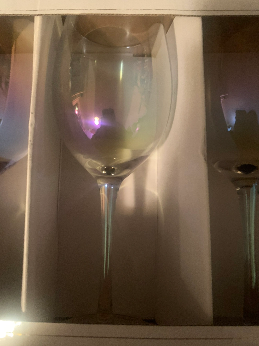 THREE wine glasses with a lustre finish. They are in their original box. Each glass is approximately 9 inches tall.