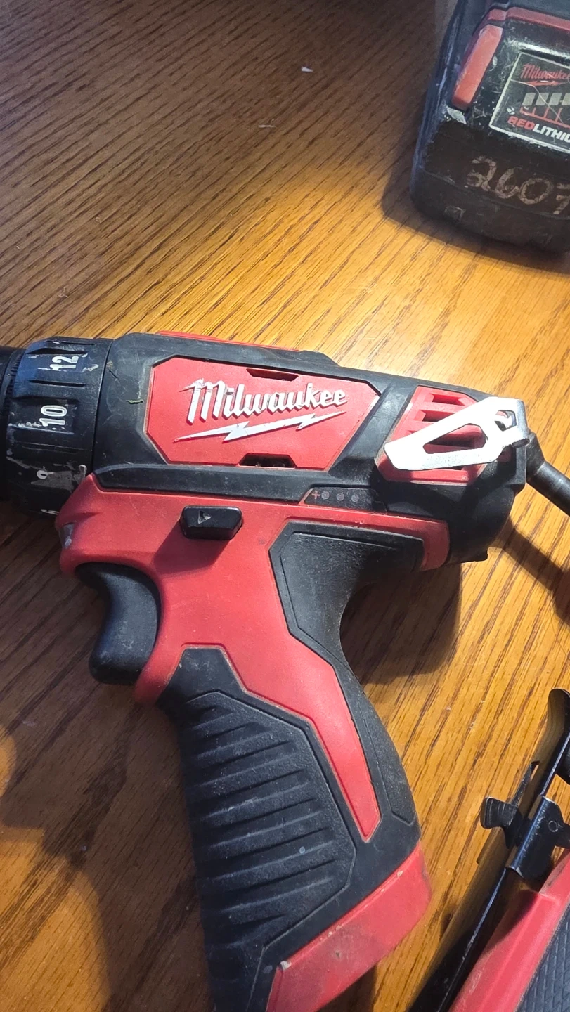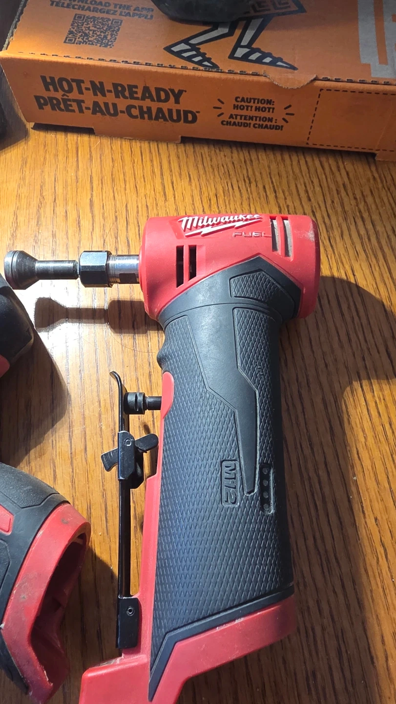 This is a Milwaukee M12 Fuel drill and a M12 Fuel rotary tool. Both are red and black. It's a great set for any DIYer or professional.