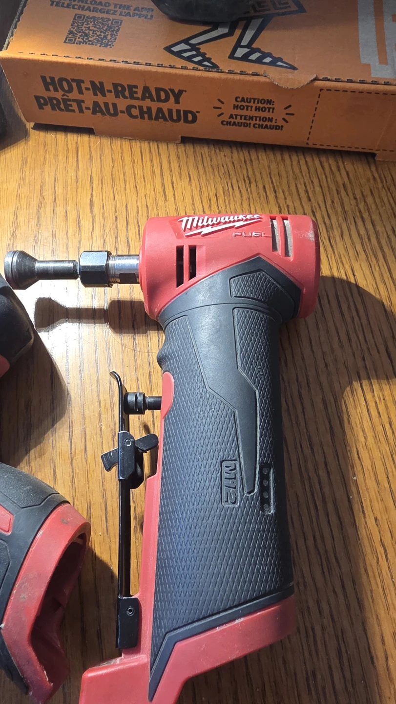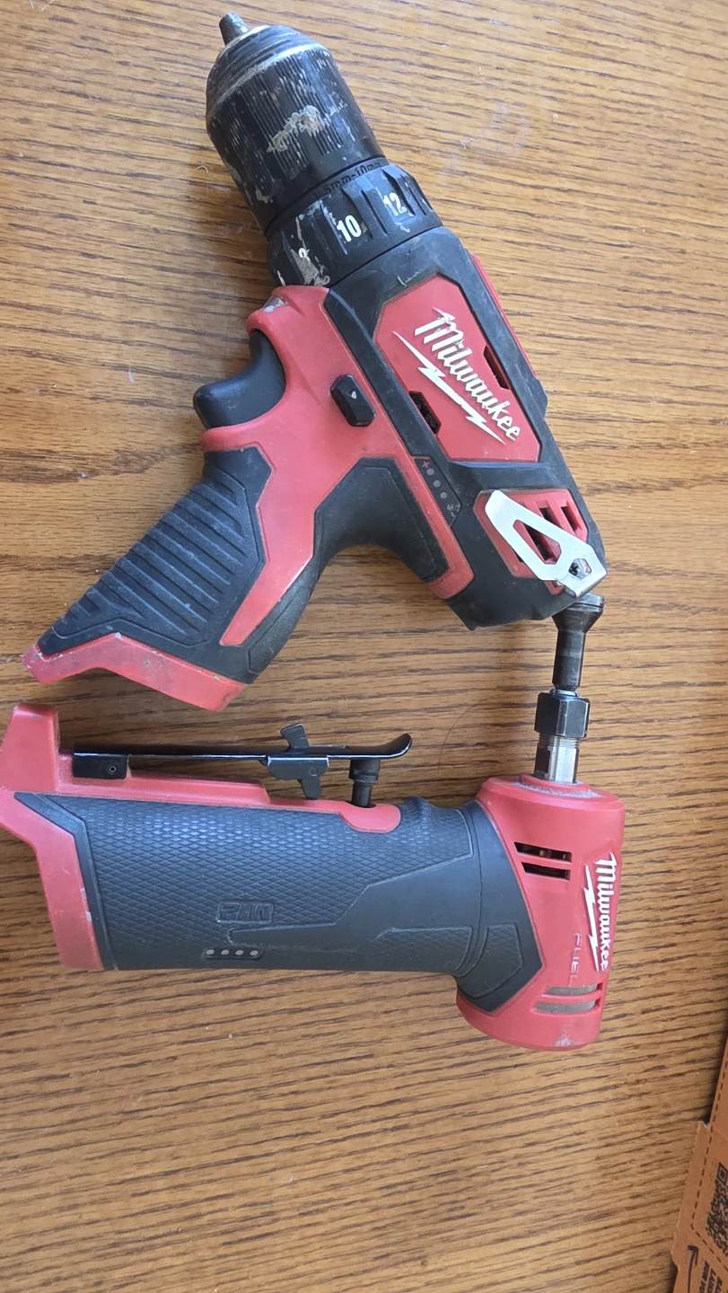 This is a Milwaukee M12 Fuel drill and a M12 Fuel rotary tool. Both are red and black. It's a great set for any DIYer or professional.