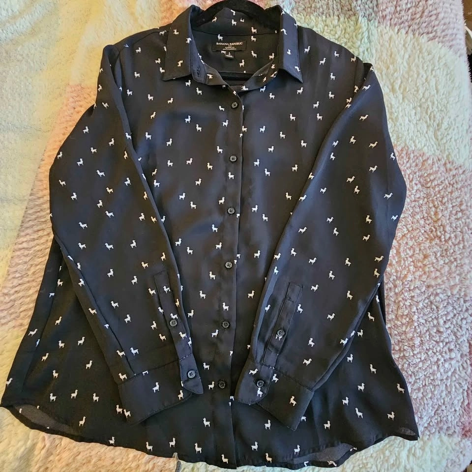 Super cute and lightweight Banana Republic button-down blouse featuring a subtle white llama print throughout. Size: Large. Fit: Classic Fit. Color: Black with white llama print. Long sleeves with button cuffs. Button front. Lightweight, flowy fabric. Great for work or casual wear. In good pre-loved condition. No major flaws. Please see photos for details. Pick up 208 & 57 Langley. Non smoking home. Let me know if you're interested!