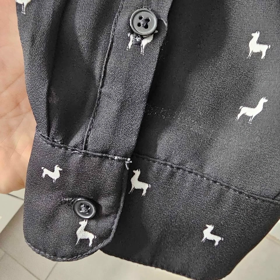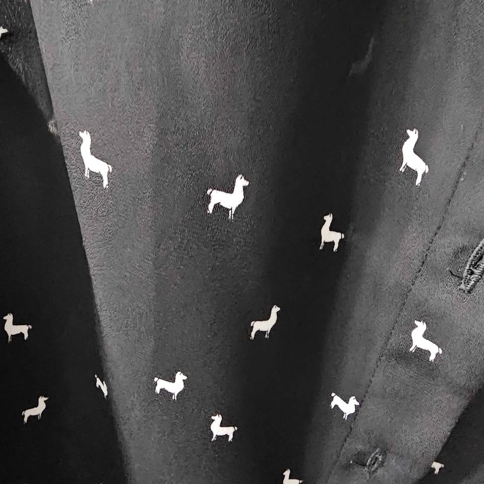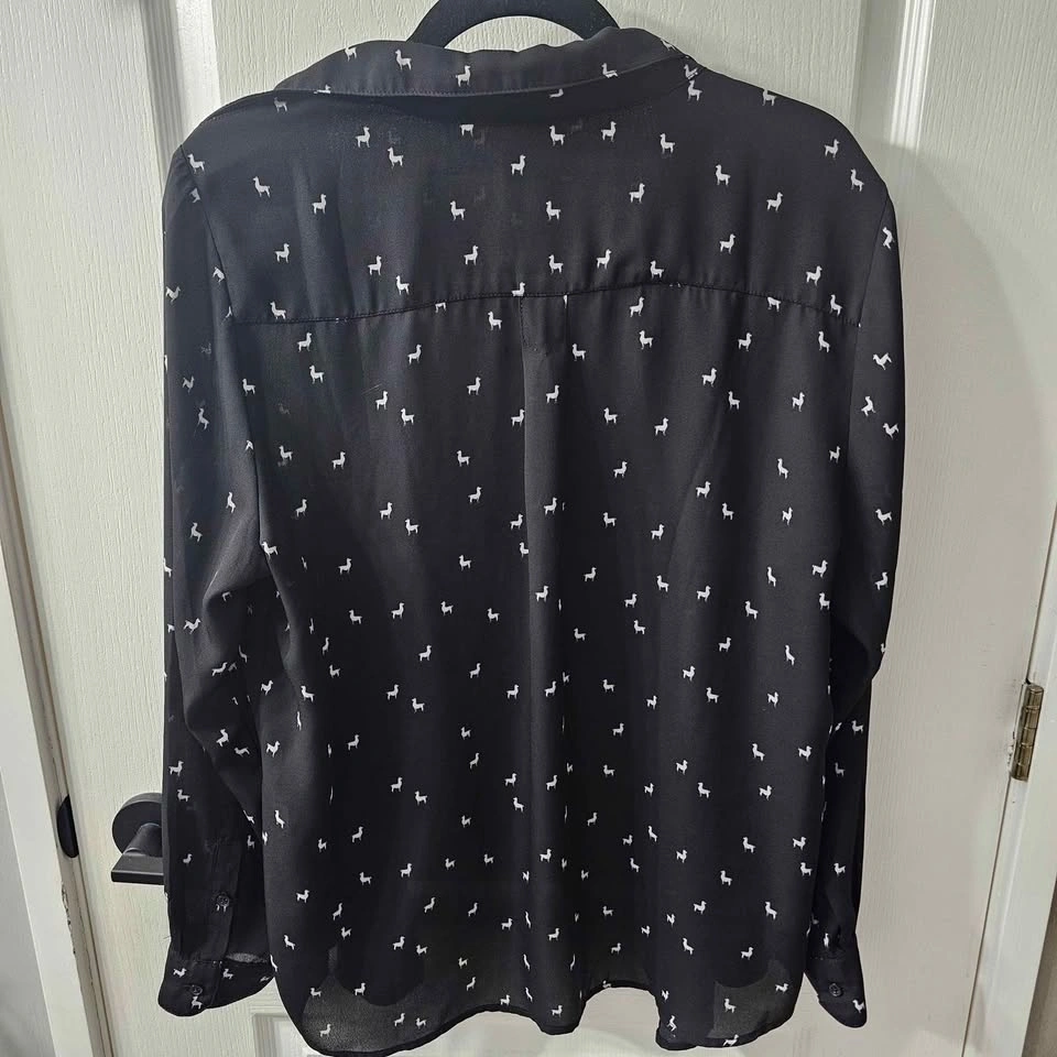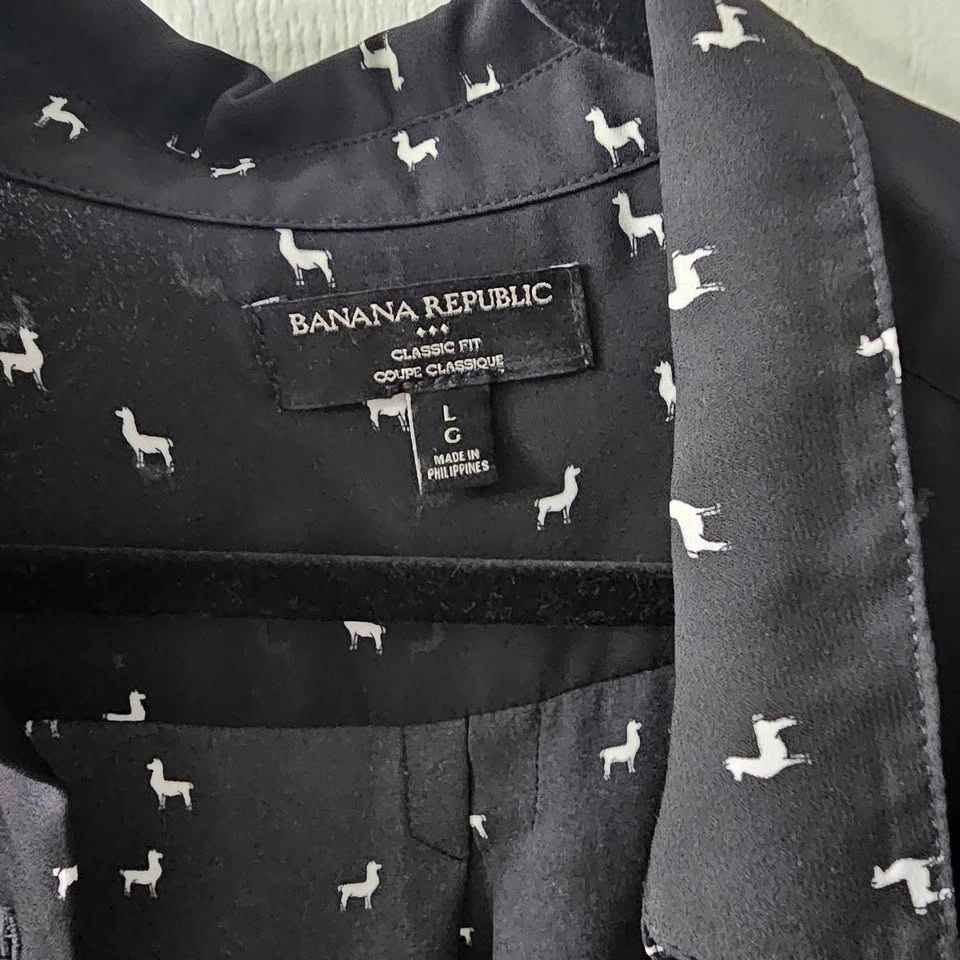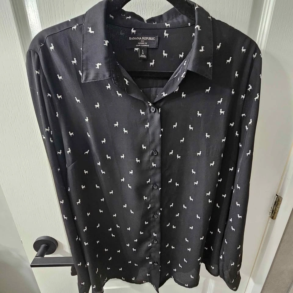 Super cute and lightweight Banana Republic button-down blouse featuring a subtle white llama print throughout. Size: Large. Fit: Classic Fit. Color: Black with white llama print. Long sleeves with button cuffs. Button front. Lightweight, flowy fabric. Great for work or casual wear. In good pre-loved condition. No major flaws. Please see photos for details. Pick up 208 & 57 Langley. Non smoking home. Let me know if you're interested!