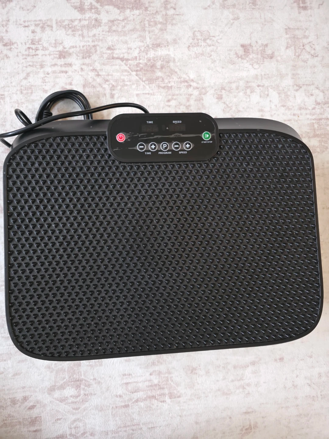 This is a black vibration plate for exercise. It features controls for time, program, and speed. The textured surface provides grip during workouts.