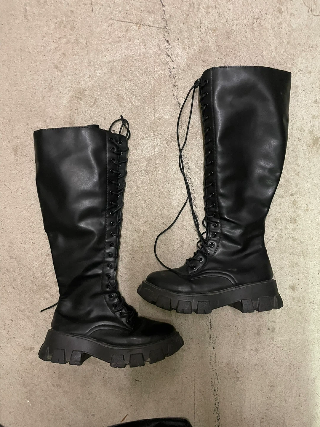 Black faux leather knee-high boots with a lace-up front and thick lug sole. These boots feature a full-length zipper on the inner side for easy wear. They're a size 38 with a UK 5.5 / US 7.5 equivalent size indicated.