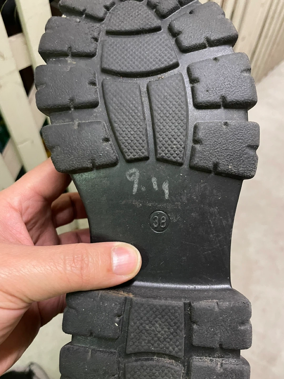 Black faux leather knee-high boots with a lace-up front and thick lug sole. These boots feature a full-length zipper on the inner side for easy wear. They're a size 38 with a UK 5.5 / US 7.5 equivalent size indicated.