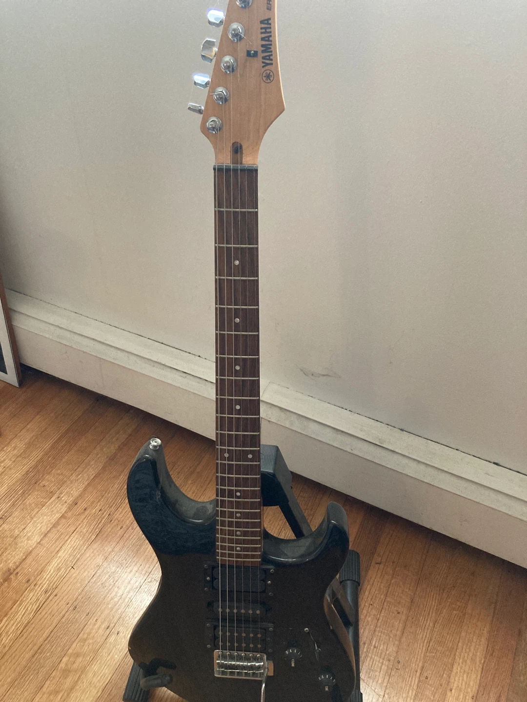 This black Yamaha electric guitar has a maple neck and rosewood fingerboard. It's in good condition and ready to play! It's a great option for beginners or intermediate players looking for a reliable instrument.