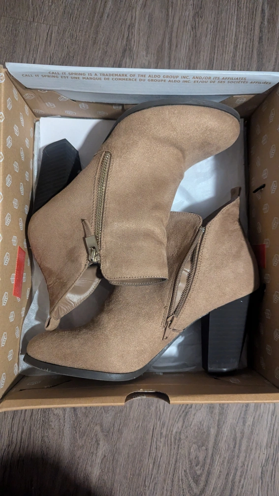 Brown suede booties with a block heel. They have a zipper on the inside of each boot. They come in the original box. Size 9 US.