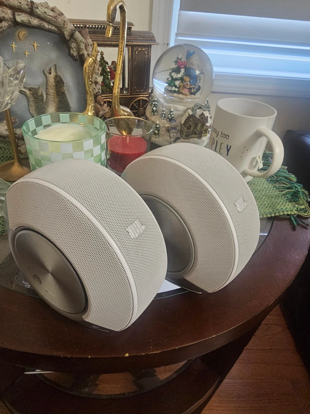 Selling a pair of white JBL satellite speakers. They're in good condition with a unique spherical design. These would be great for a surround sound setup!
