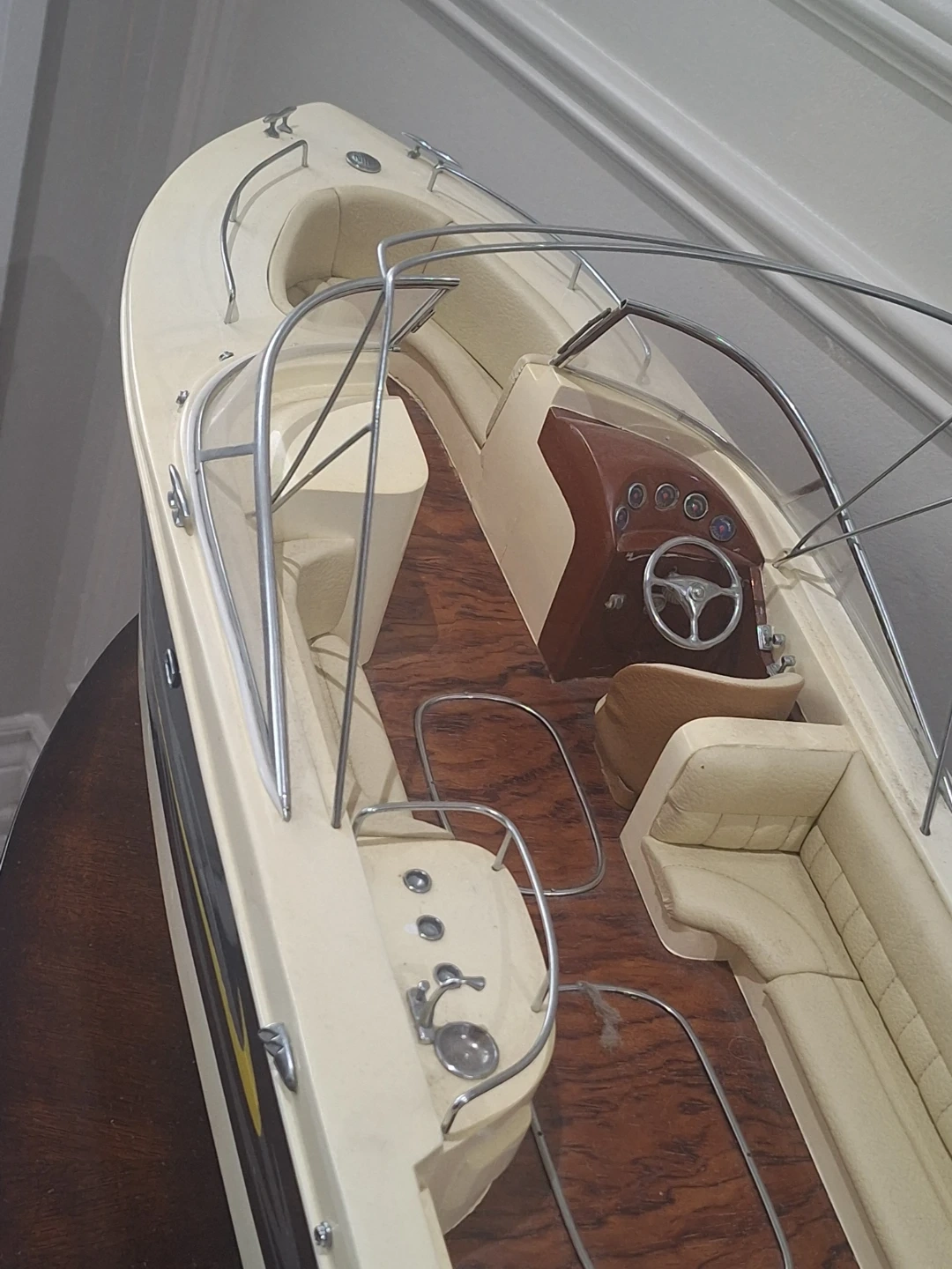 This is a model of a Four Winns boat. It has detailed interior seating and a wooden-look floor. The model features a steering wheel and windscreen.