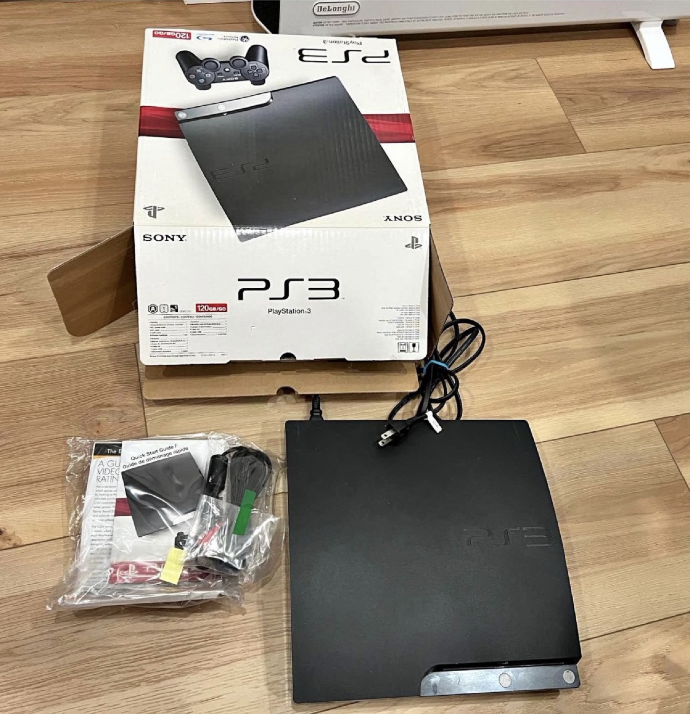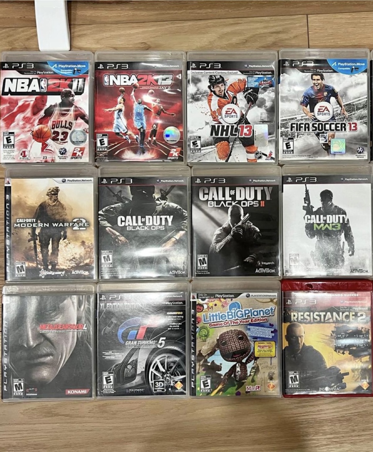 PS3 Slim console with box, power cable, and HDMI cable. 13 games included: NBA 2K12, NBA 2K13, NHL 13, FIFA Soccer 13, Call of Duty: Modern Warfare 3, Call of Duty: Black Ops 2, Call of Duty: Black Ops, Call of Duty: MW3, Metal Gear Solid 4, Gran Turismo 5, LittleBigPlanet: Game of the Year Edition, Resistance 2, and a bonus game.