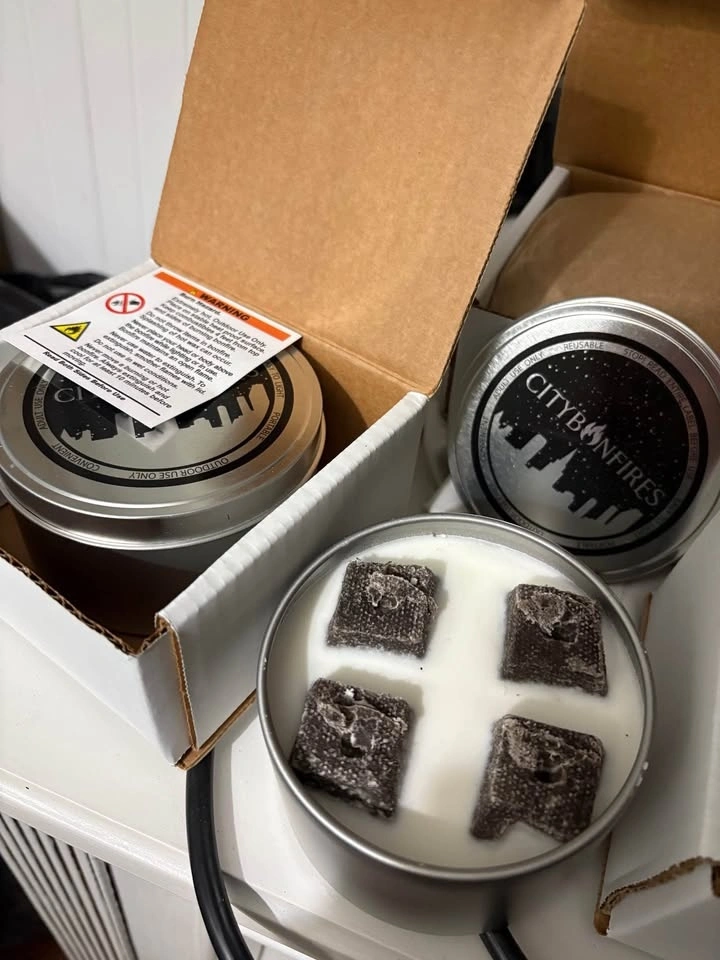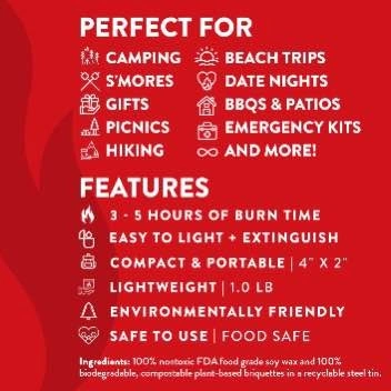 Eco-friendly, 100% non-toxic FDA approved food-grade soy wax, 100% biodegradable, compostable, plant-based briquettes, recyclable steel tin.