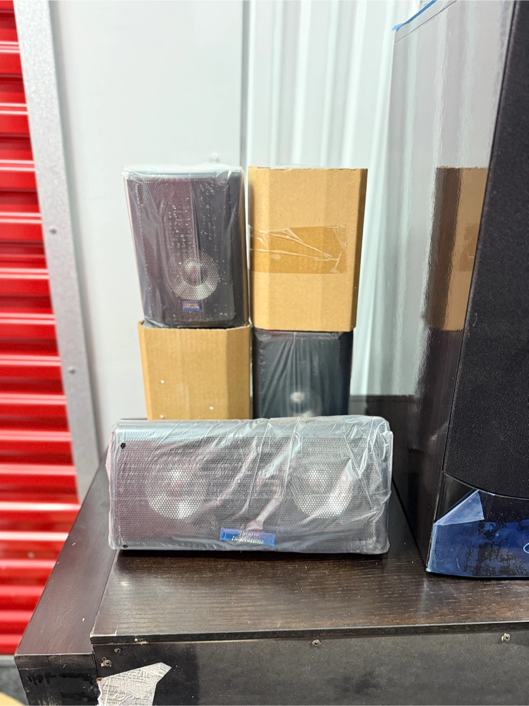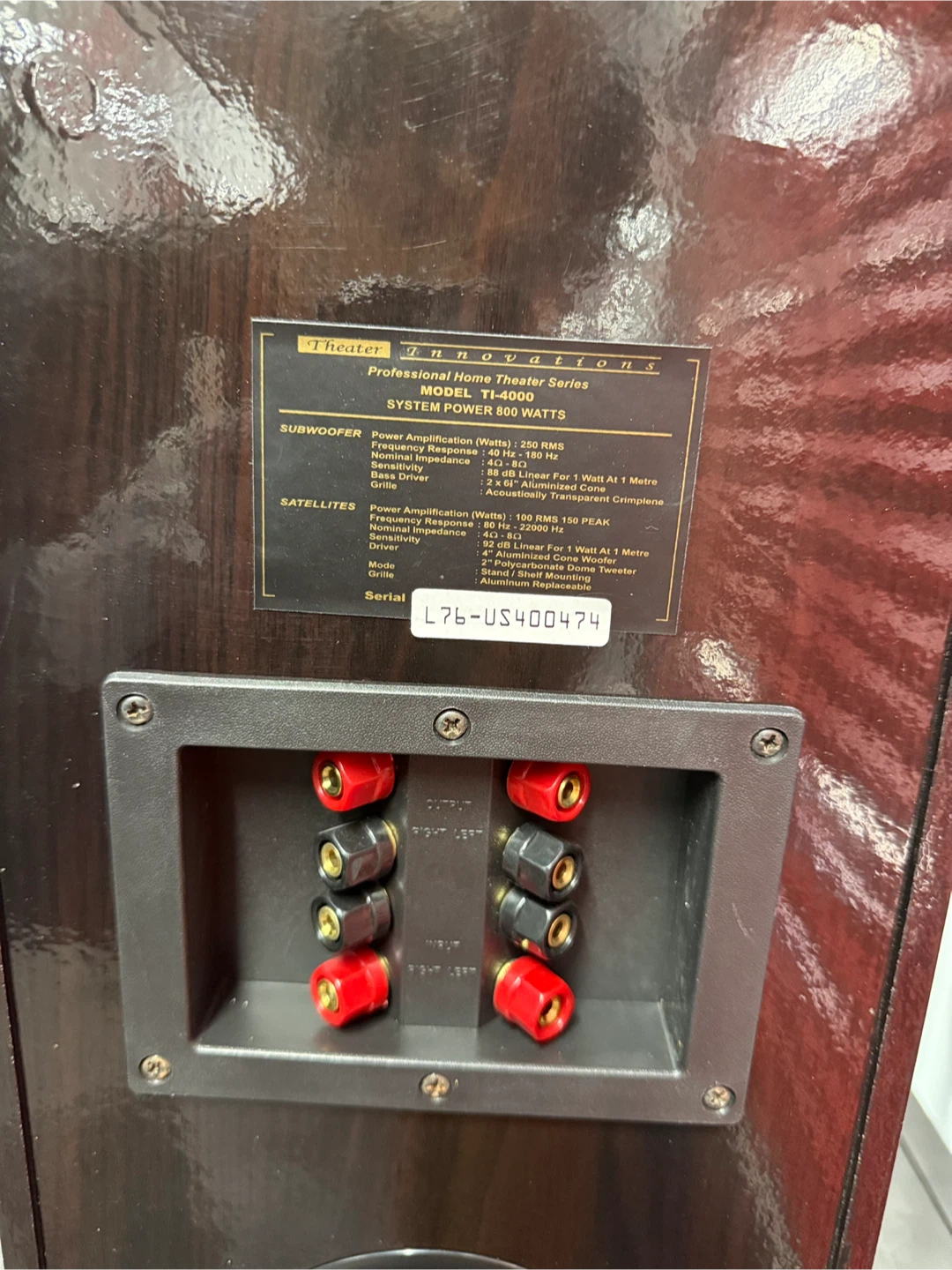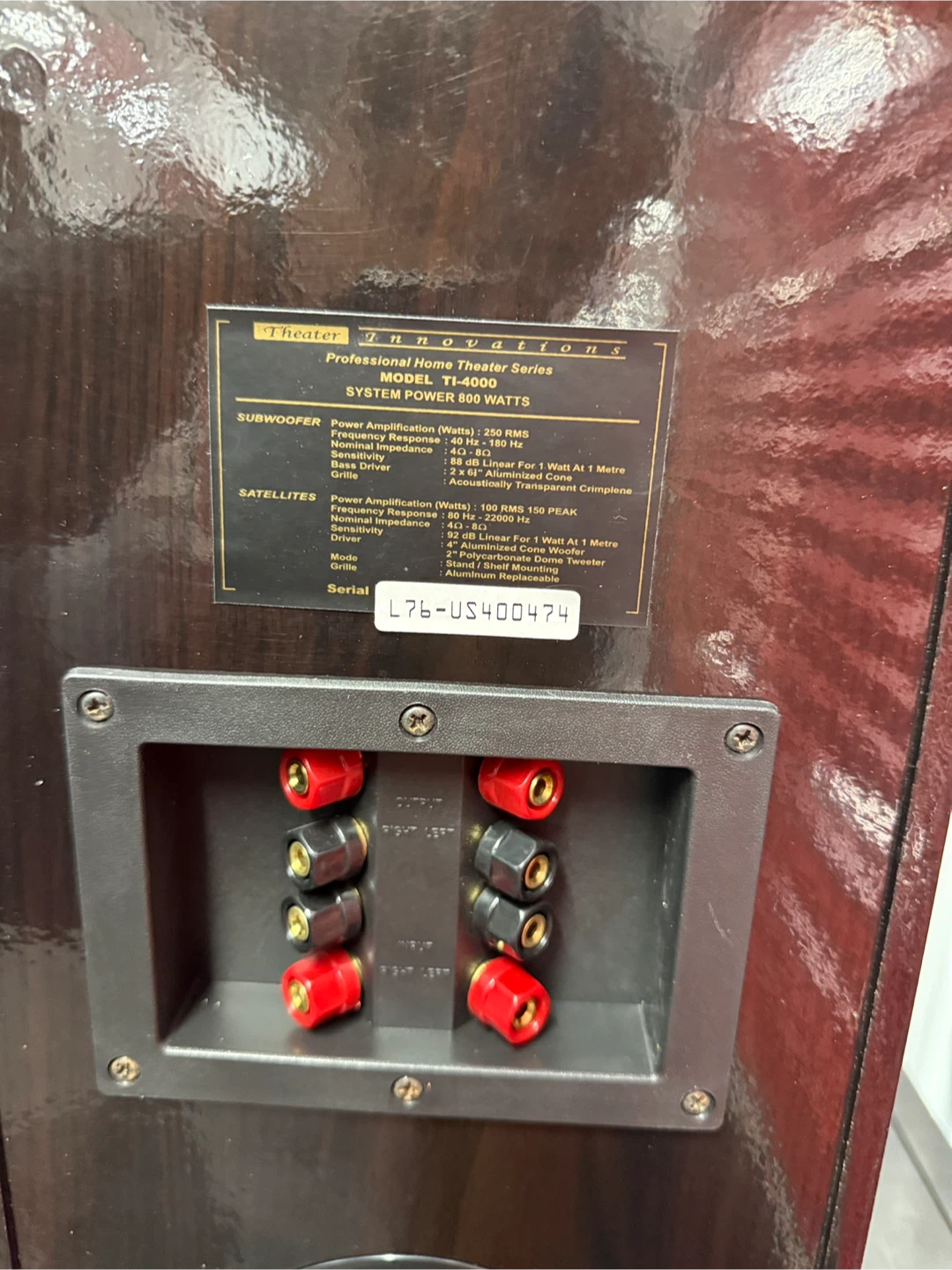 Selling a Theater Innovations Professional Home Theater Series TI-4000 system. It has a system power of 800 Watts. The satellites have an acoustically transparent crimplene grille. Perfect for a home theater setup!