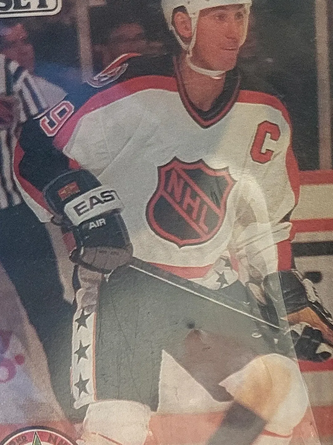 This is a trading card featuring an NHL hockey player. The card shows a player in a white jersey with red and black trim, and the NHL logo. It includes the 'C' for captain on the jersey. The player is wearing 'EAST AIR' gloves.