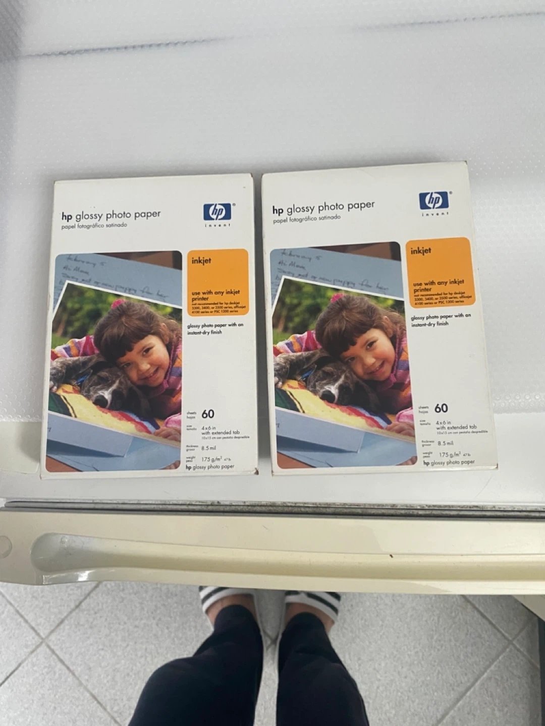 Two packs of HP glossy photo paper. Each pack contains 60 sheets of 4x6 inch photo paper. It's designed for inkjet printers and has an instant-dry finish. Paper weight is 175 g/m².