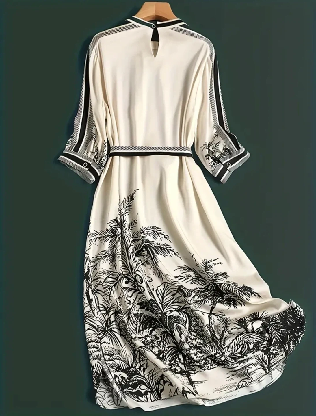 A cream-coloured midi dress featuring a black floral and palm leaf print. It has a round neckline with a black trim and a matching black and white striped belt. The sleeves are three-quarter length with a flared cuff. It's a lovely choice for a dressy daytime event or a casual evening out!