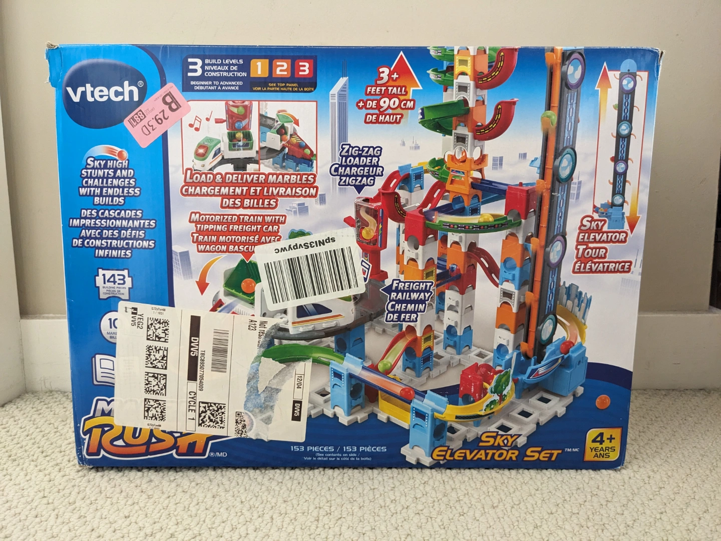 - A sky elevator, motorized freight train and crazy curves all easily connect; 10 colorful marbles are included in this 153-piece set