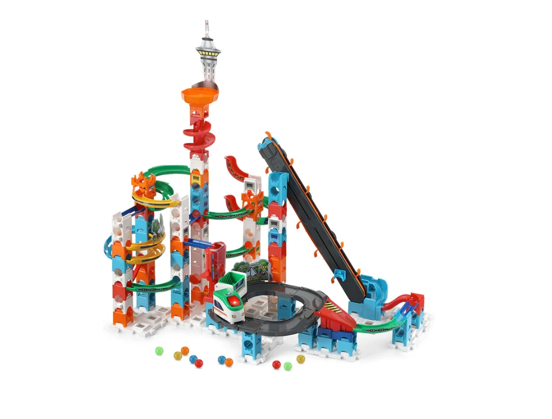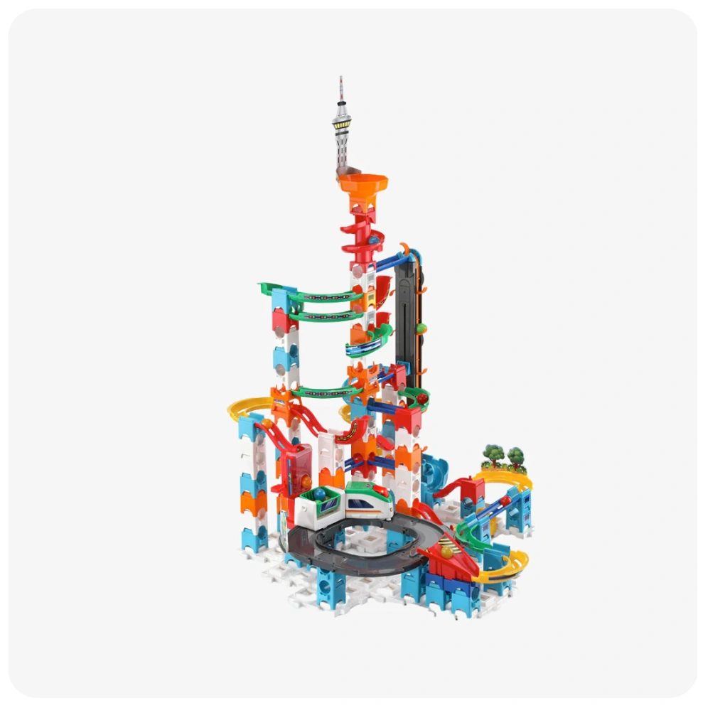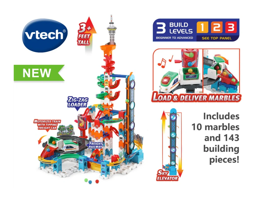 - Compete with family and friends to build an up to 3-foot-tall set and keep the marbles moving with a sky elevator and motorized freight train