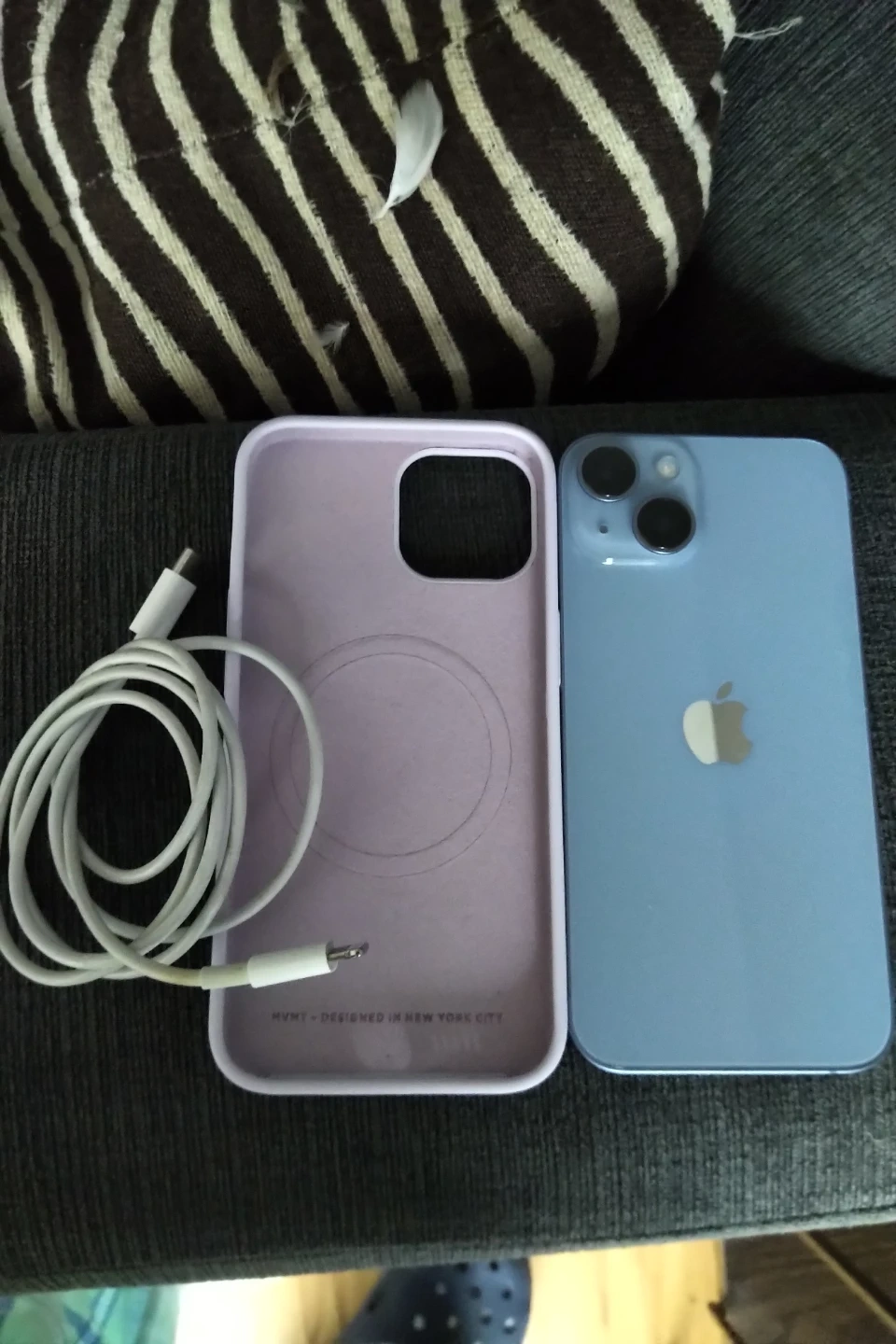 This is an Apple iPhone 14 in blue. It comes with a charging cable. It also includes a light purple case.