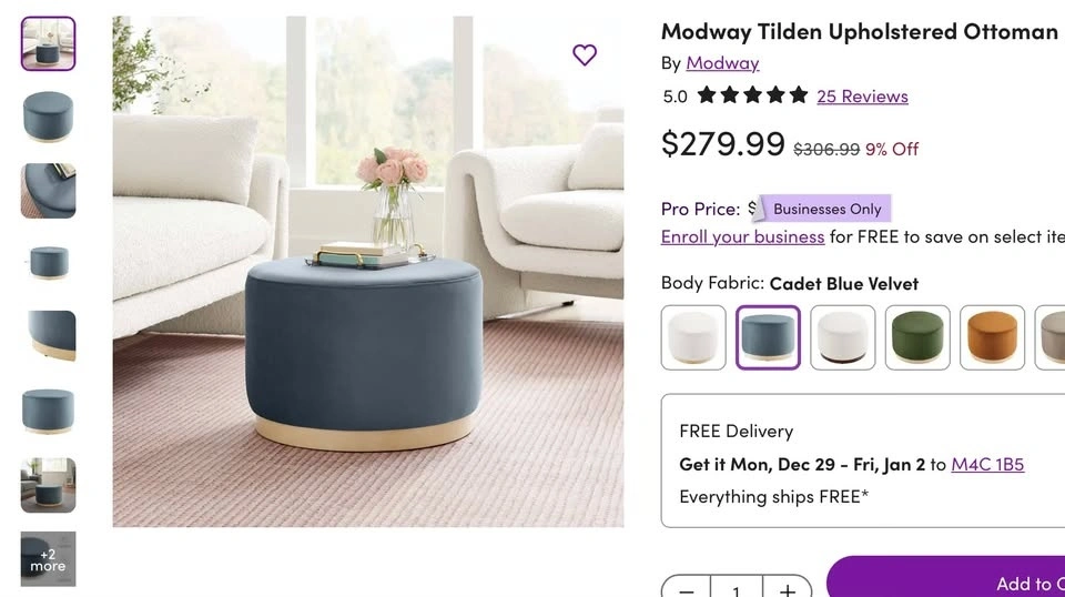 Brand new in box. Retails for $316 with tax. Lush velvet ottoman with a solid wood detailed base. Can be used as a side table with a tray, a coffee table, or as a foot rest. Dimensions: 16" H x 23" D. Fabric: stain resistant velvet. Solid rubberwood plinth/base. Non-marking foot glides. Pickup in North York or Midtown Toronto. Feel free to message if you have any questions!