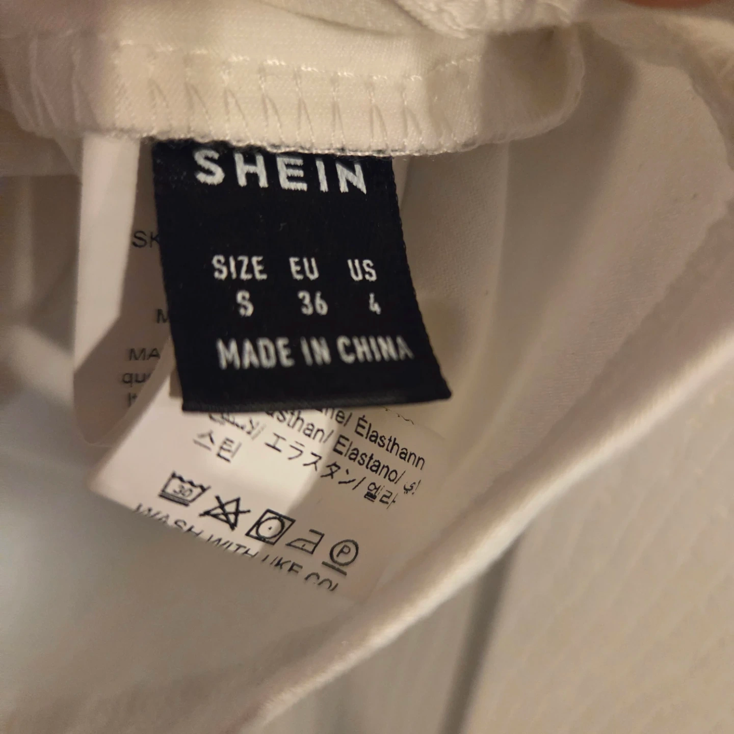 This is a white, sleeveless tank top from SHEIN with a ruched front detail and a square neckline. It's made of a polyester and elastane blend. Size is small.