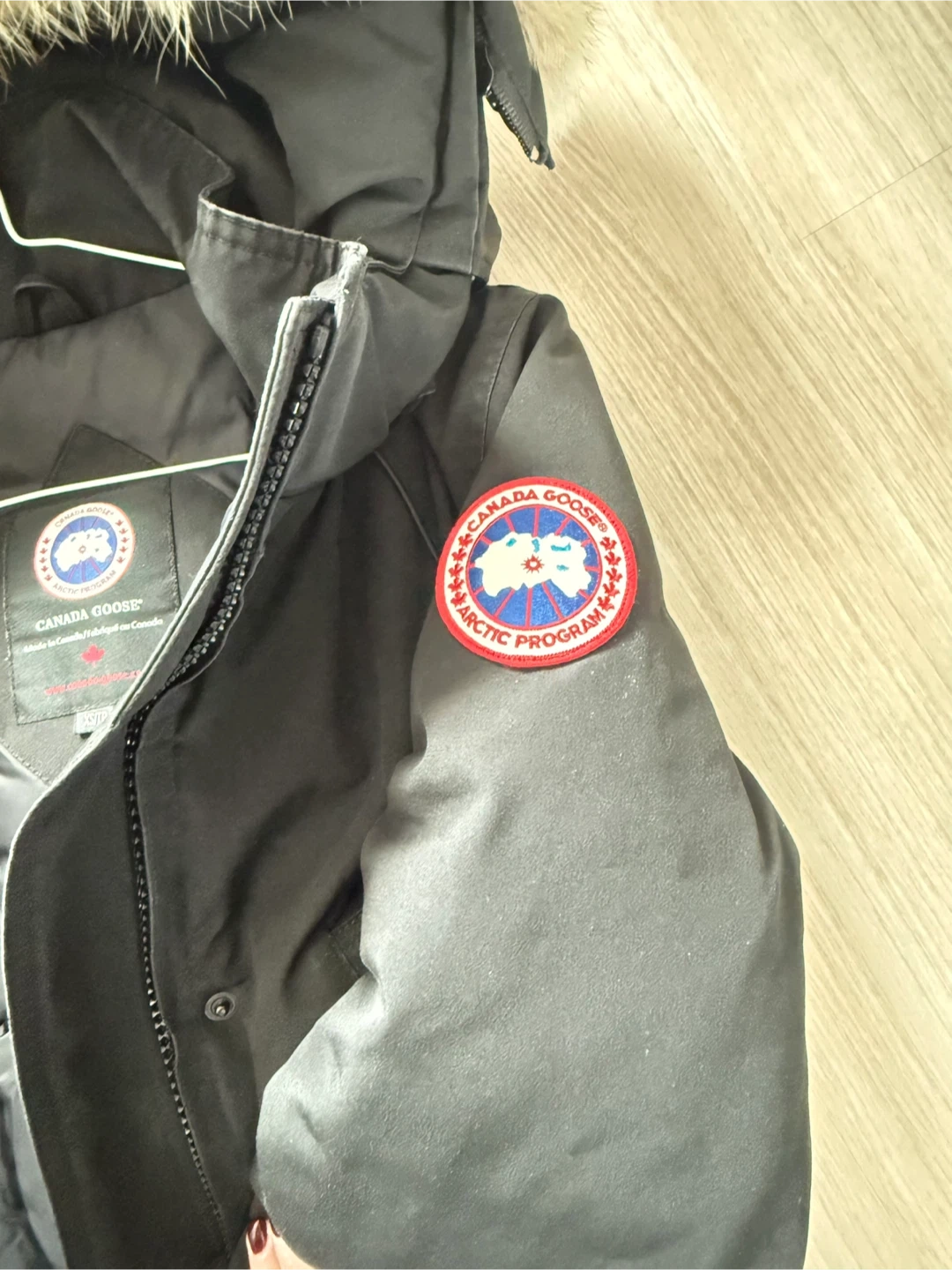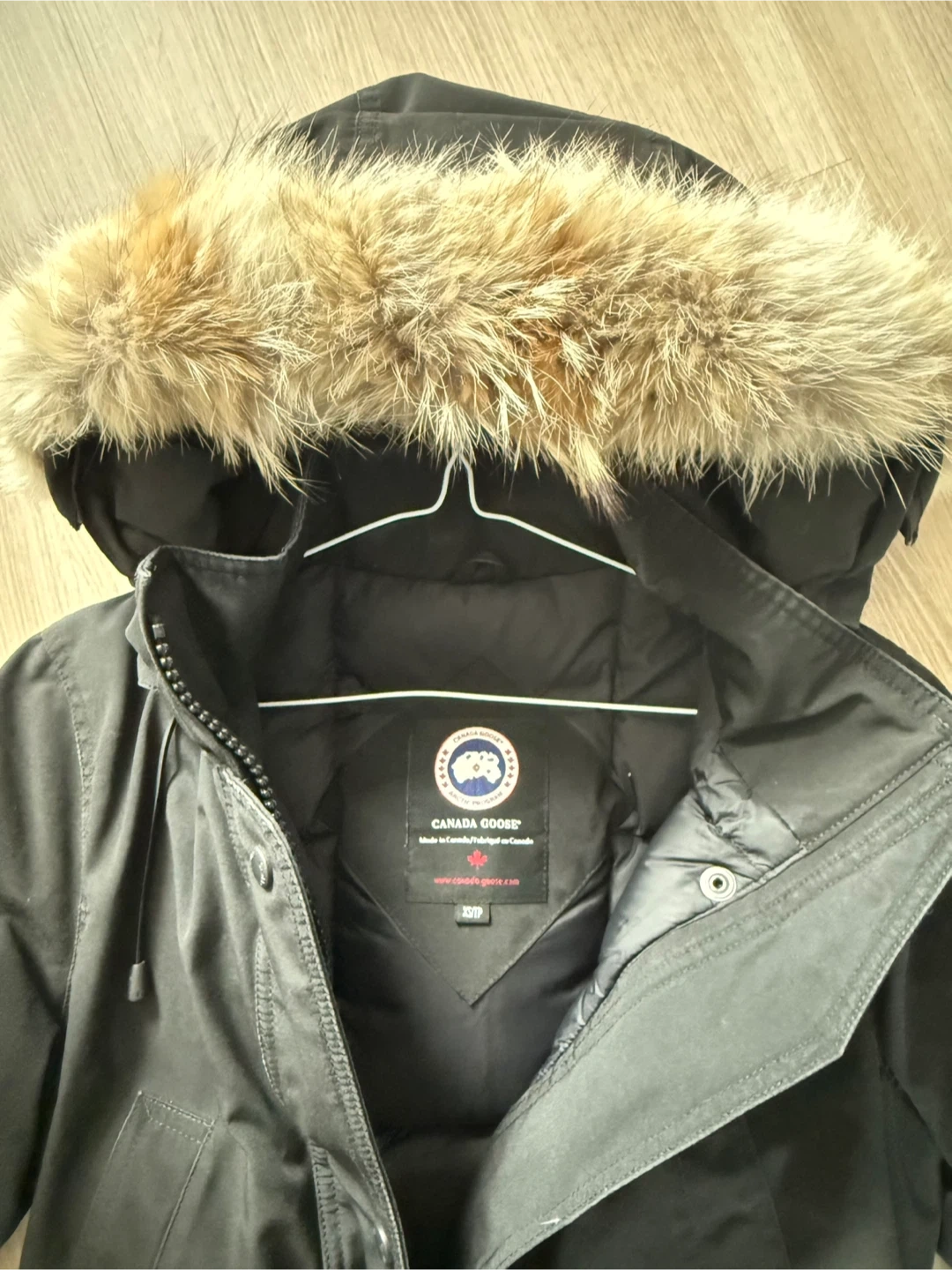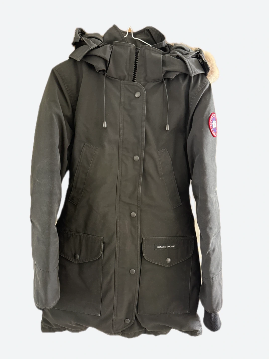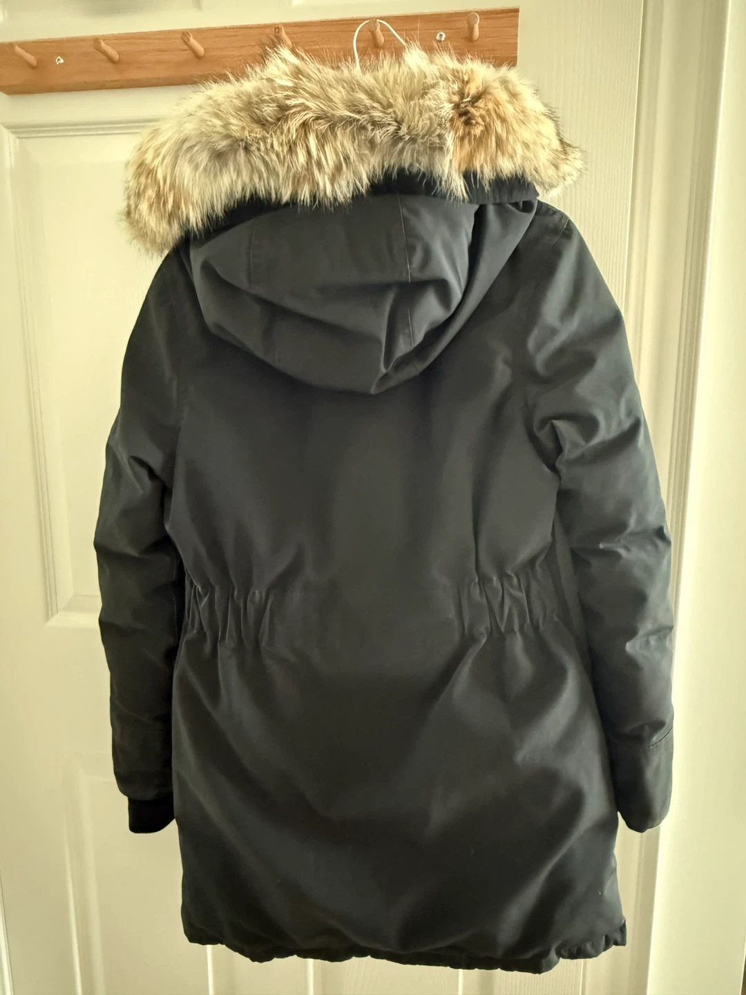 Authentic Canada Goose Trillium Parka, women’s XS, black. Good used condition with moderate visible wear/fading on sleeves and seams from normal use. No rips or functional issues. Warm, structured, and fully wearable. Fur trim included.
