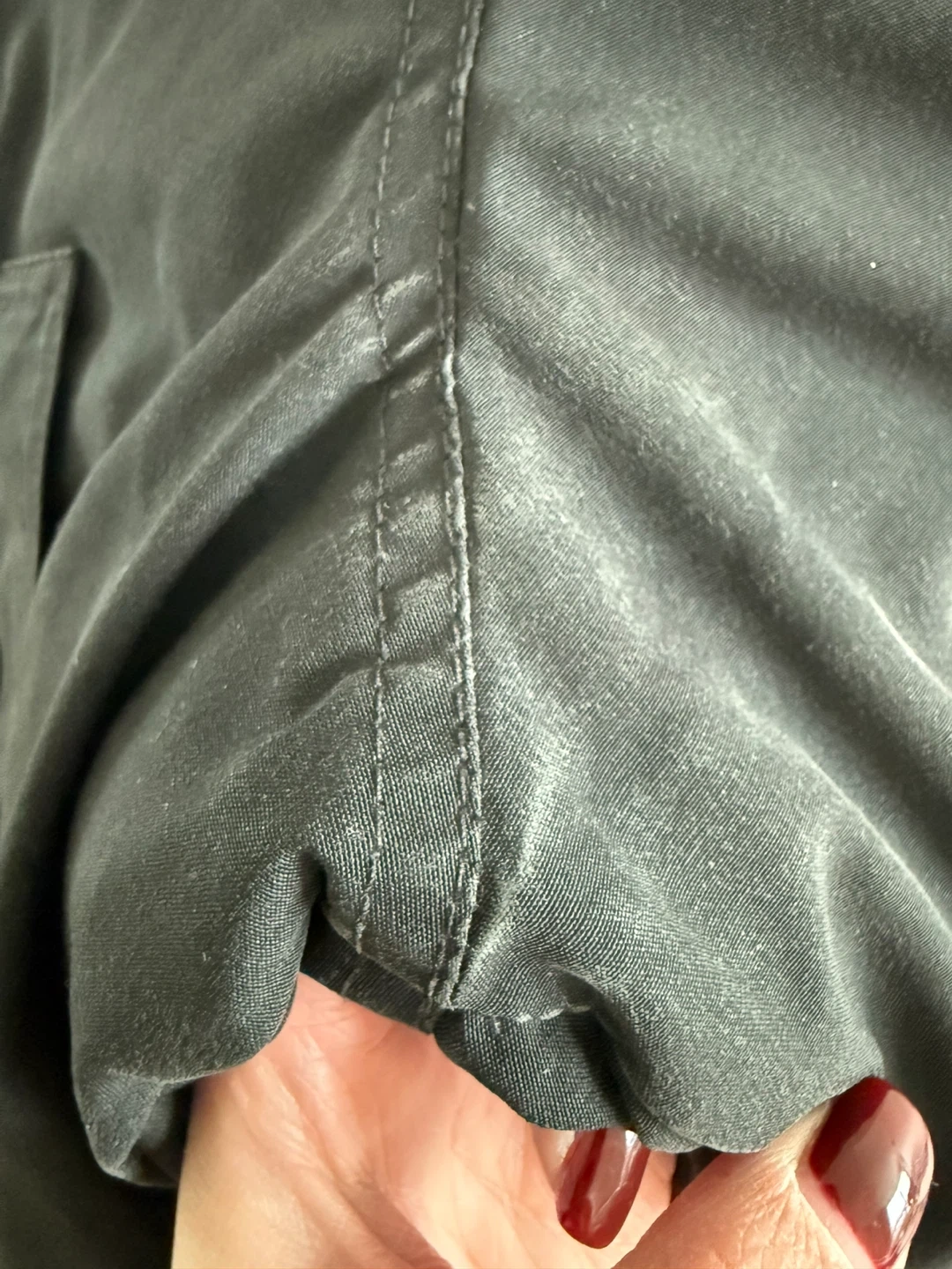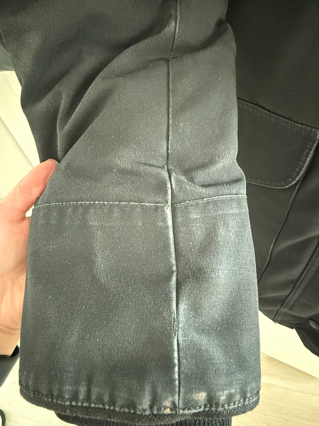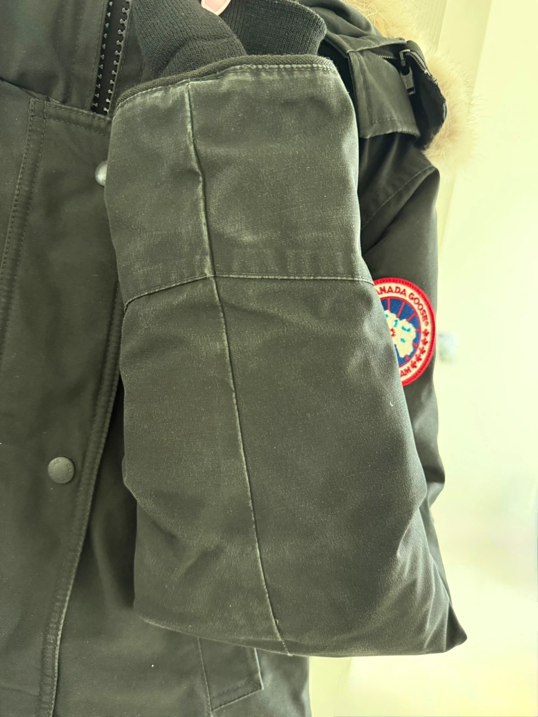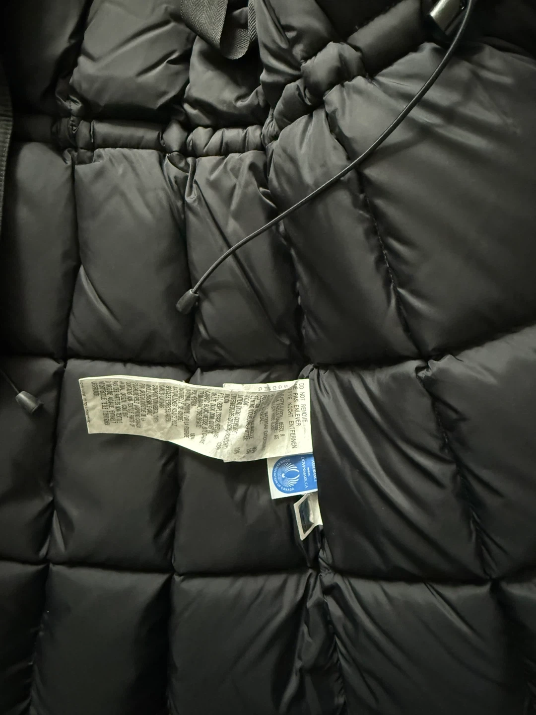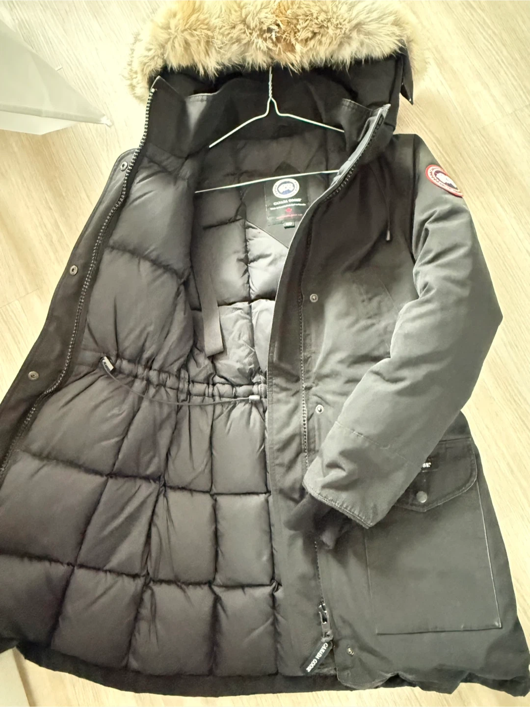 Authentic Canada Goose Trillium Parka, women’s XS, black. Good used condition with moderate visible wear/fading on sleeves and seams from normal use. No rips or functional issues. Warm, structured, and fully wearable. Fur trim included.