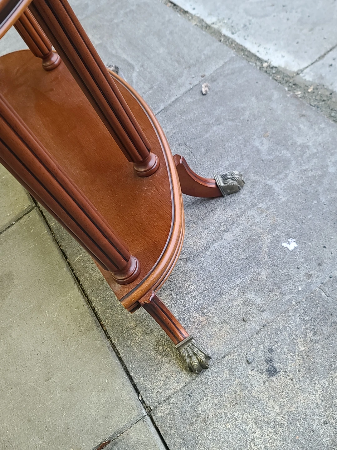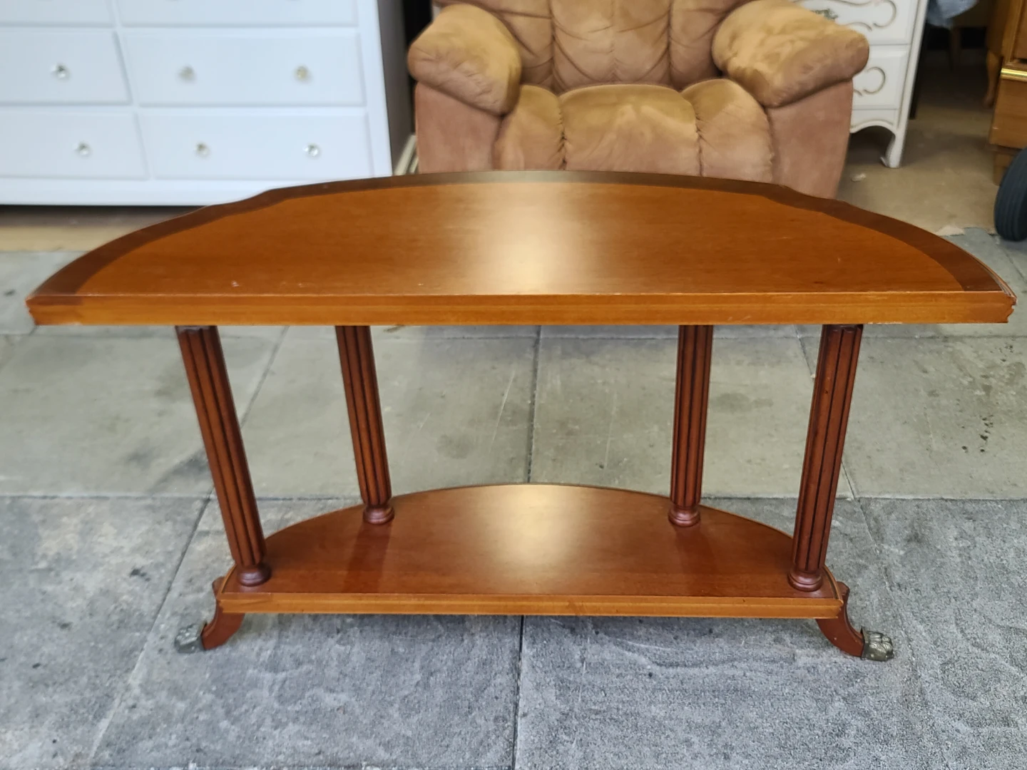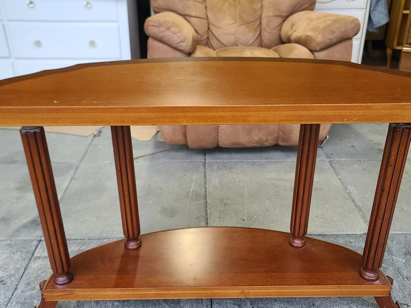 A lovely wood half-moon accent table! It features a two-tiered design with elegant legs. Perfect for adding a touch of classic style to any room. Measurements to follow. Delivery can be arranged. Viewing and pickup by appointment.