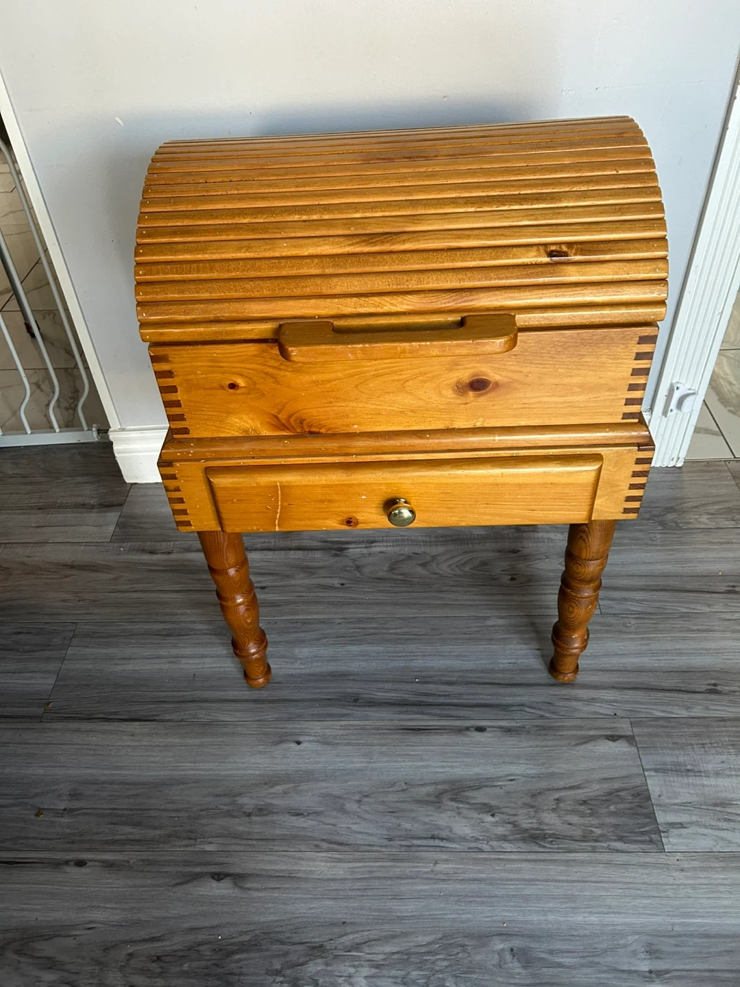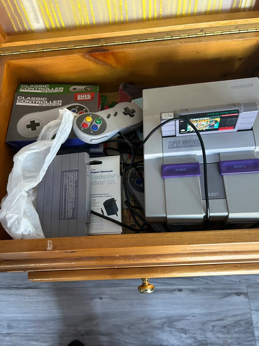 This wooden sewing cabinet has a roll-top design and a small drawer. It includes a Super Nintendo Entertainment System console, a Classic Controller, and a SNES power adapter. Great for organizing sewing supplies and playing classic video games!