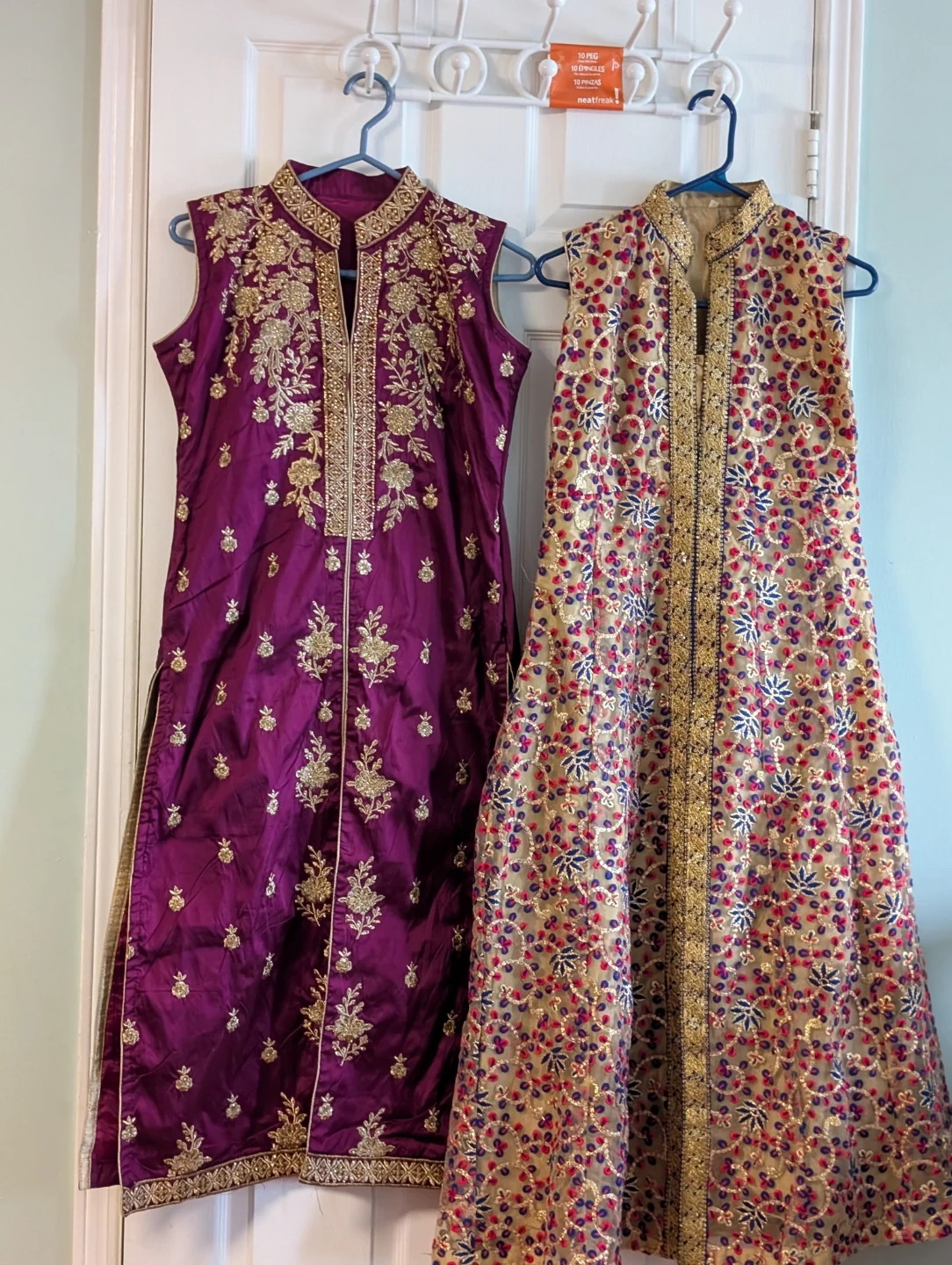 A plum sleeveless tunic and a beige embroidered floor-length dress. Both feature intricate gold embroidery and a high neckline. Perfect for cultural events or festive occasions!