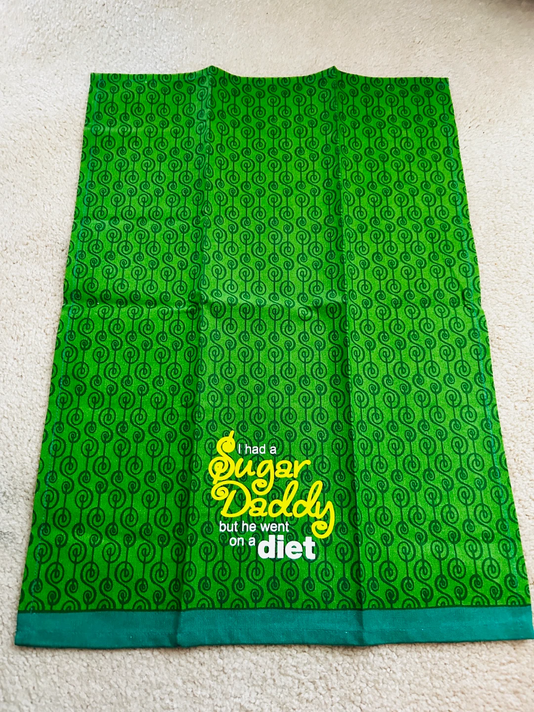 Brand new cotton kitchen towel with a a humorous text graphic reading "I had a Sugar Daddy but he went on a diet" in yellow and white. Makes a fun addition to any kitchen!