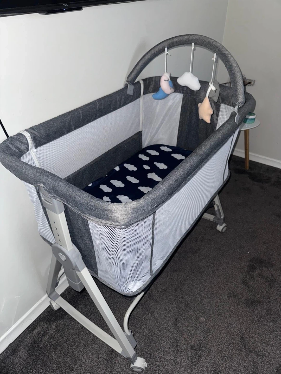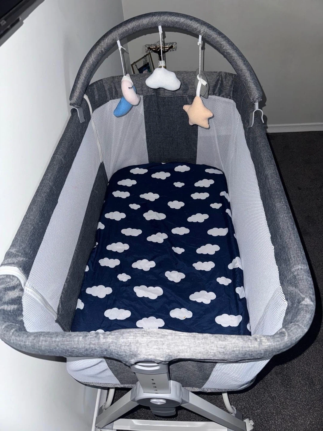 Grey bedside crib with adjustable height settings. It features mesh sides for ventilation and comes with a mattress that has a cute cloud pattern. A mobile with moon and star shapes is attached. This crib is designed for convenience for new parents.