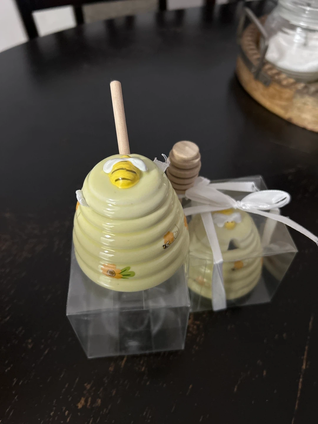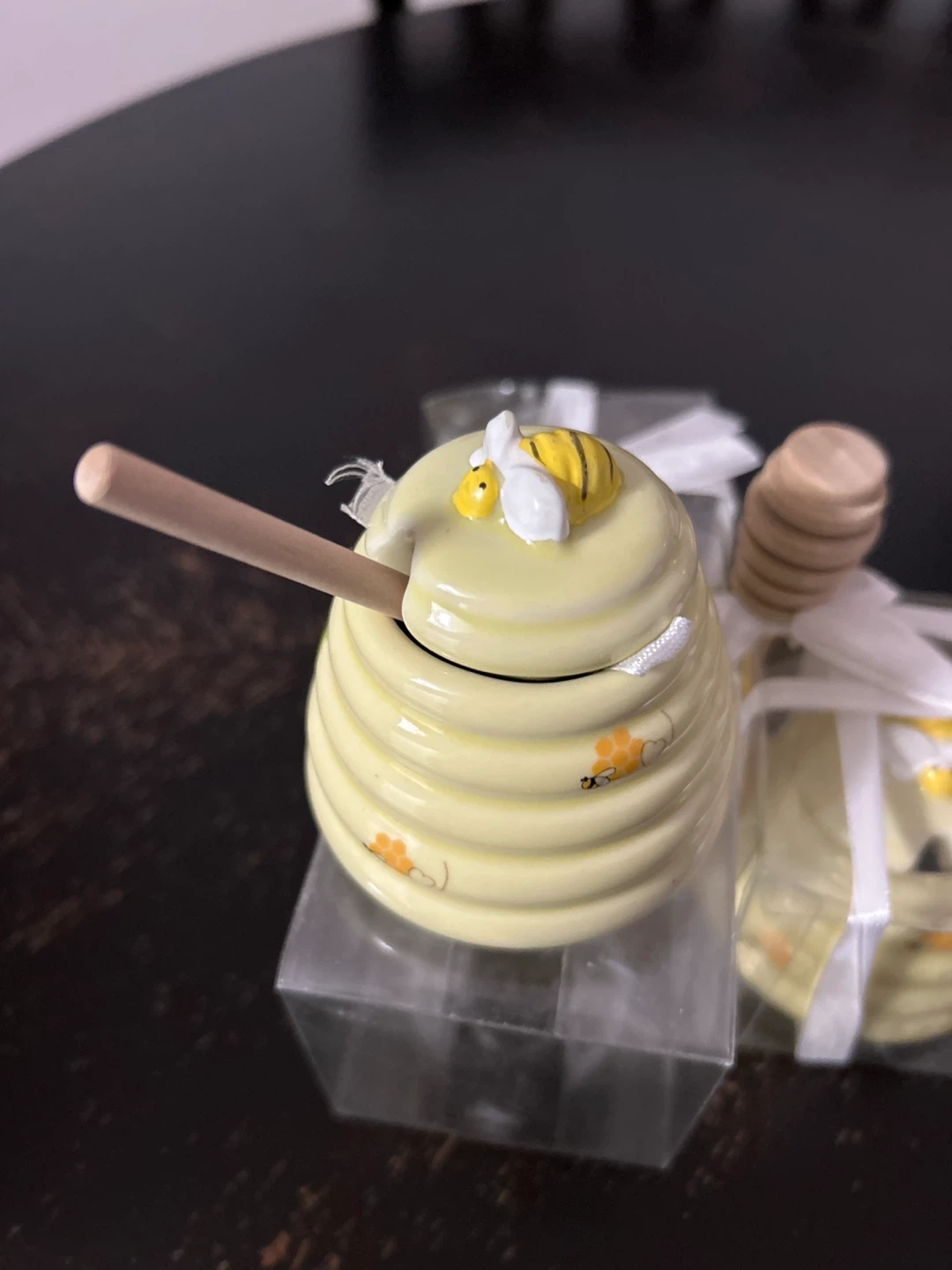 This set includes three charming, hive-shaped honey pots. Each pot comes with a wooden honey dipper and is individually packaged in a clear box, tied with a white ribbon. They're decorated with cute bees and flowers.