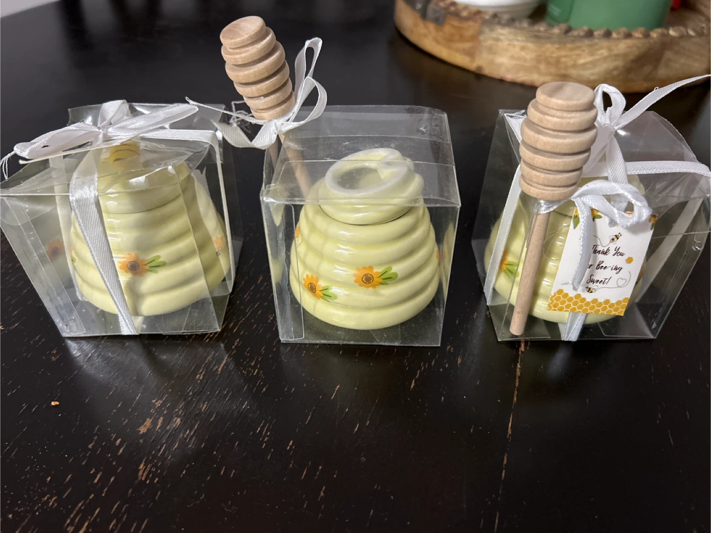 This set includes three charming, hive-shaped honey pots. Each pot comes with a wooden honey dipper and is individually packaged in a clear box, tied with a white ribbon. They're decorated with cute bees and flowers.