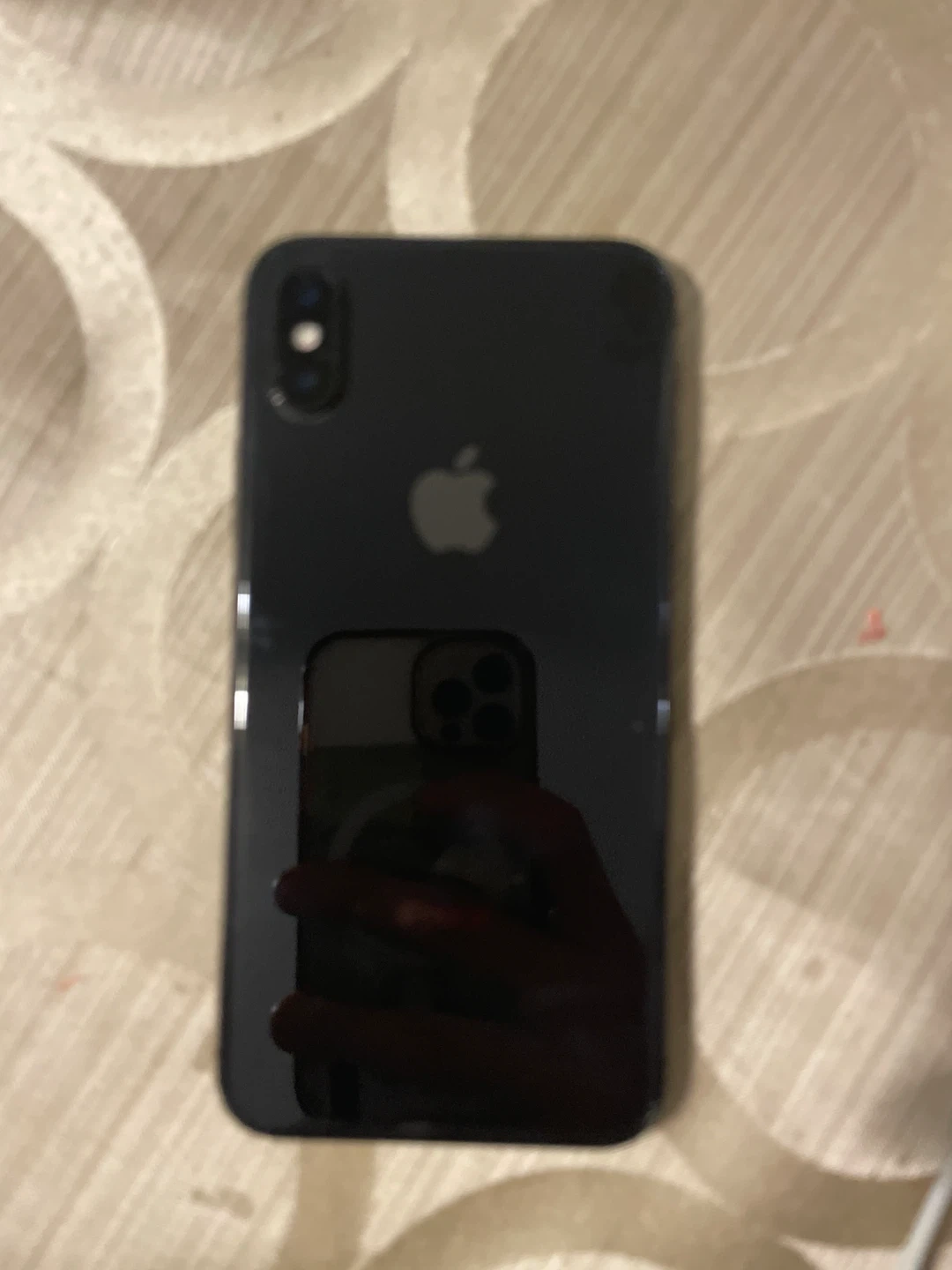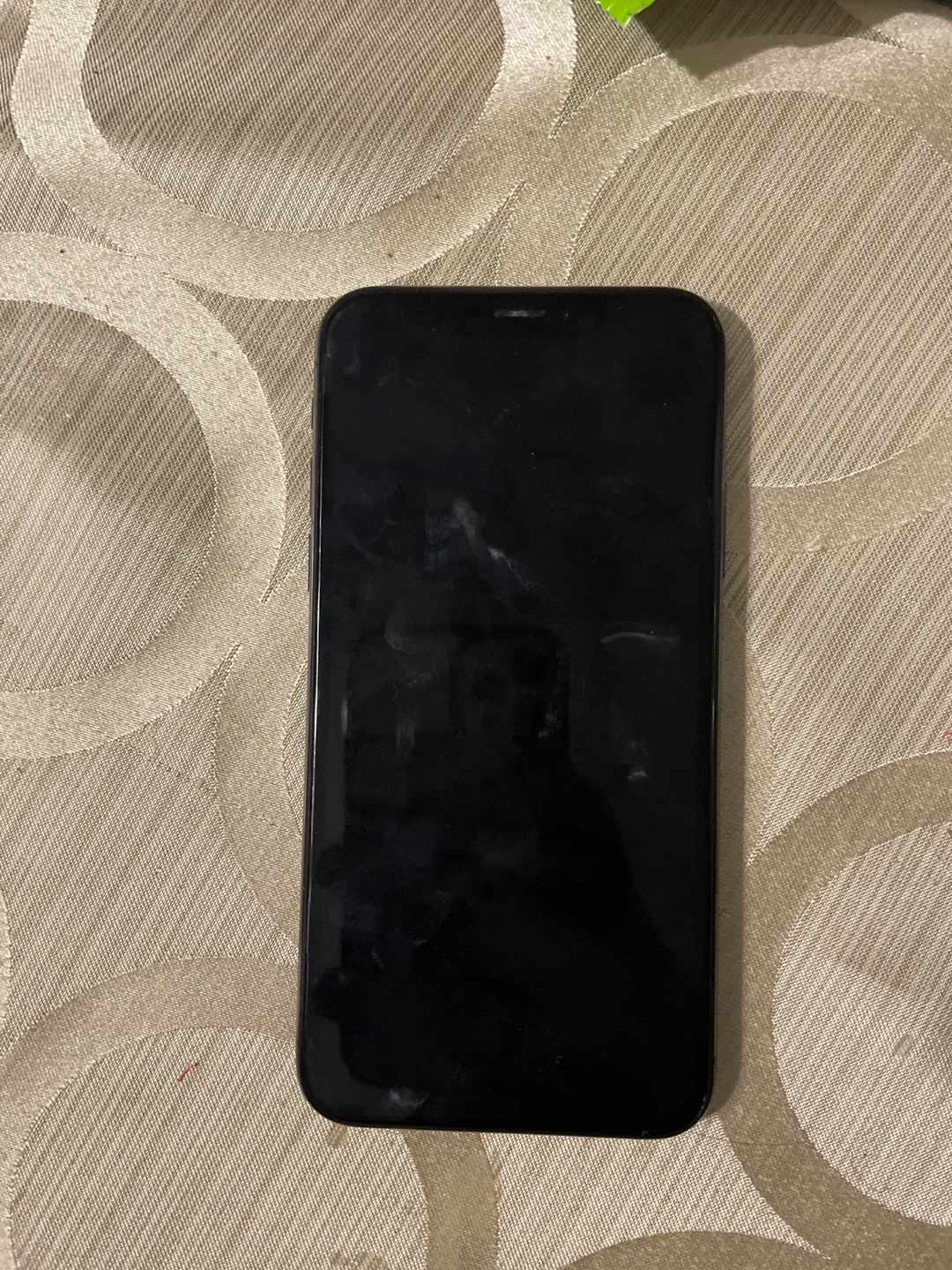 Black Apple iPhone. It's a smartphone that's been used. It comes with a dual-camera system.