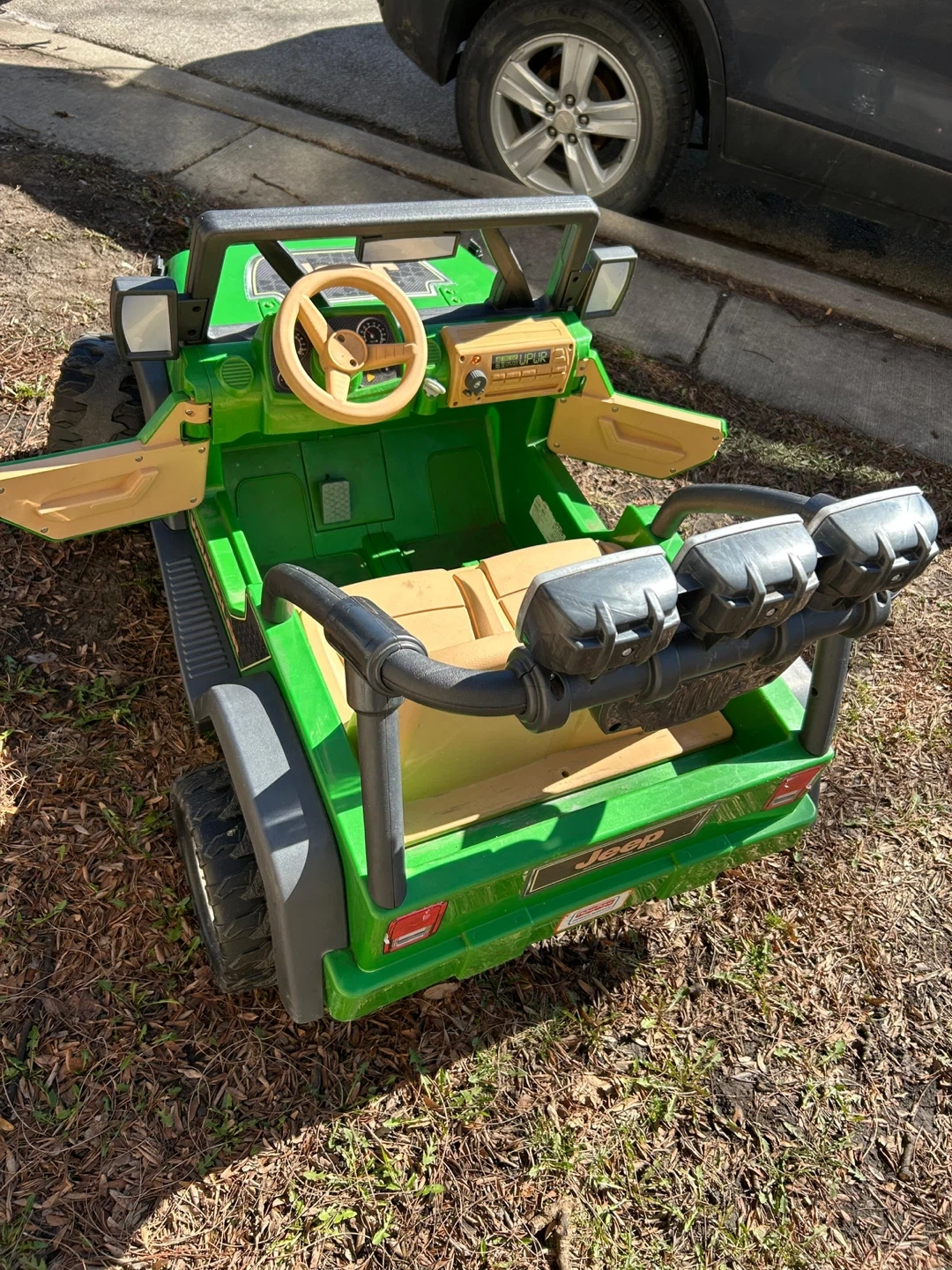 This is a green Jeep ride-on toy car for kids. It features two tan seats and a functional steering wheel. Has realistic details like headlights and a grill.