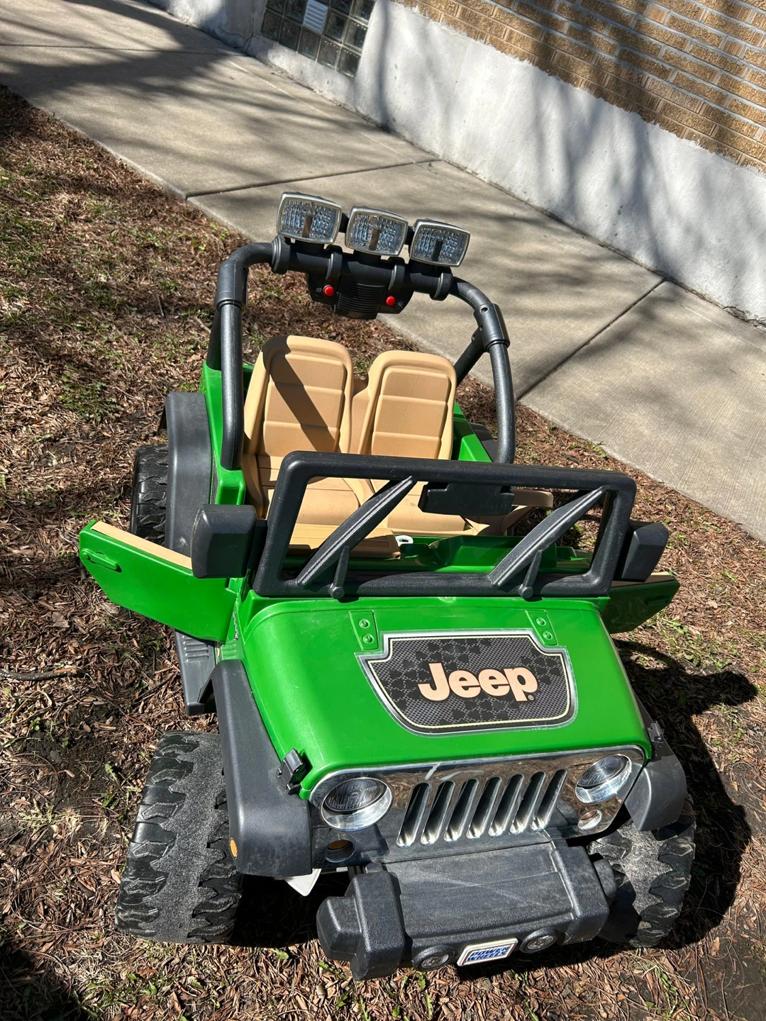 This is a green Jeep ride-on toy car for kids. It features two tan seats and a functional steering wheel. Has realistic details like headlights and a grill.