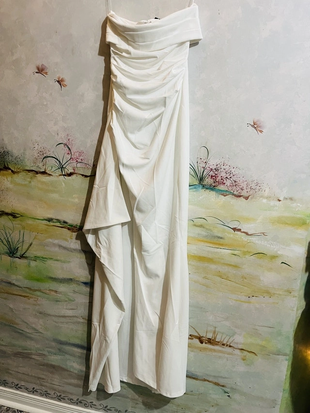 Selling a beautiful, brand new BabyBoo white Maxi dress that features a stunning strapless design and an elegant side slit, perfect for special occasions. Here are some additional details: