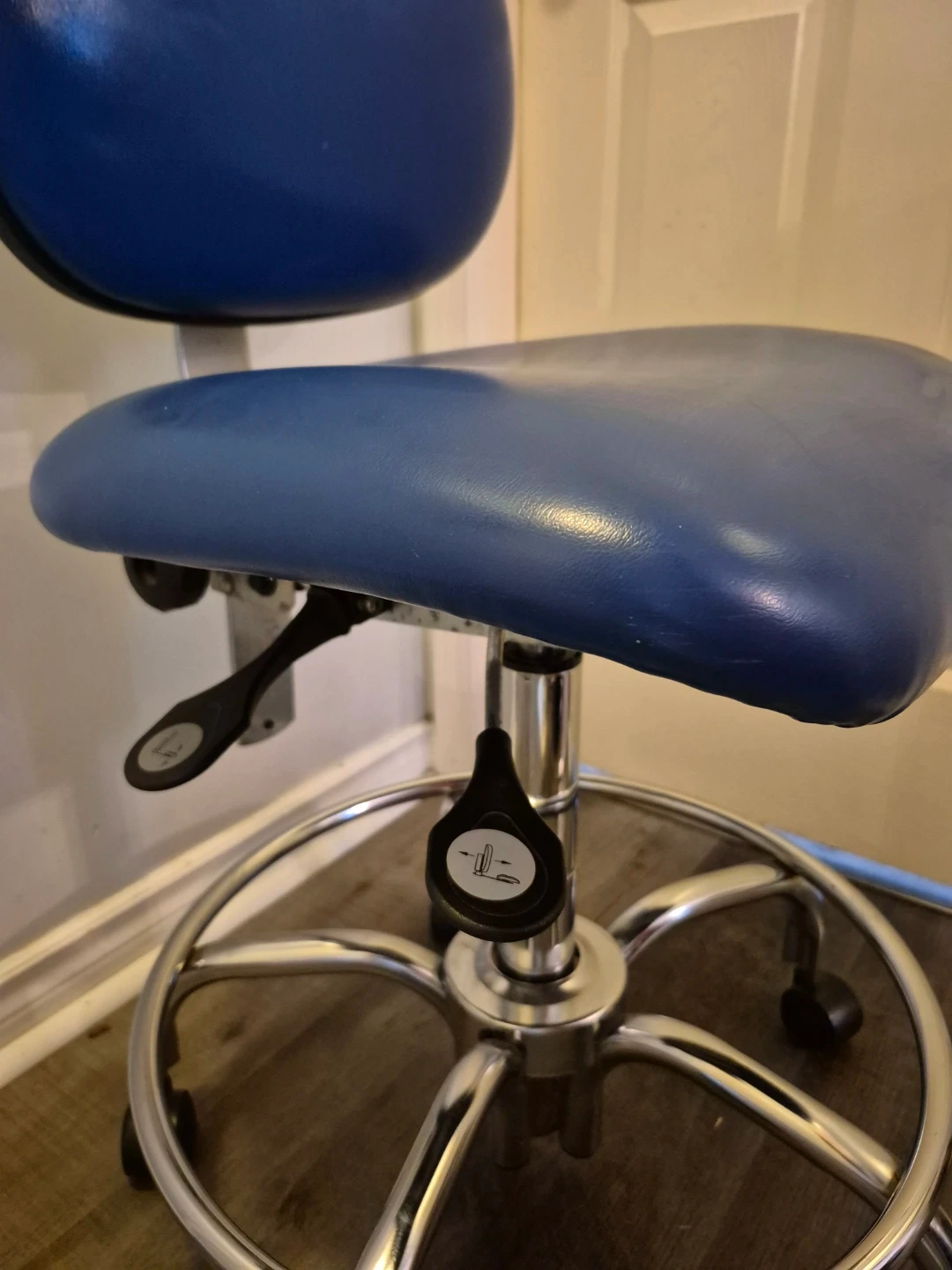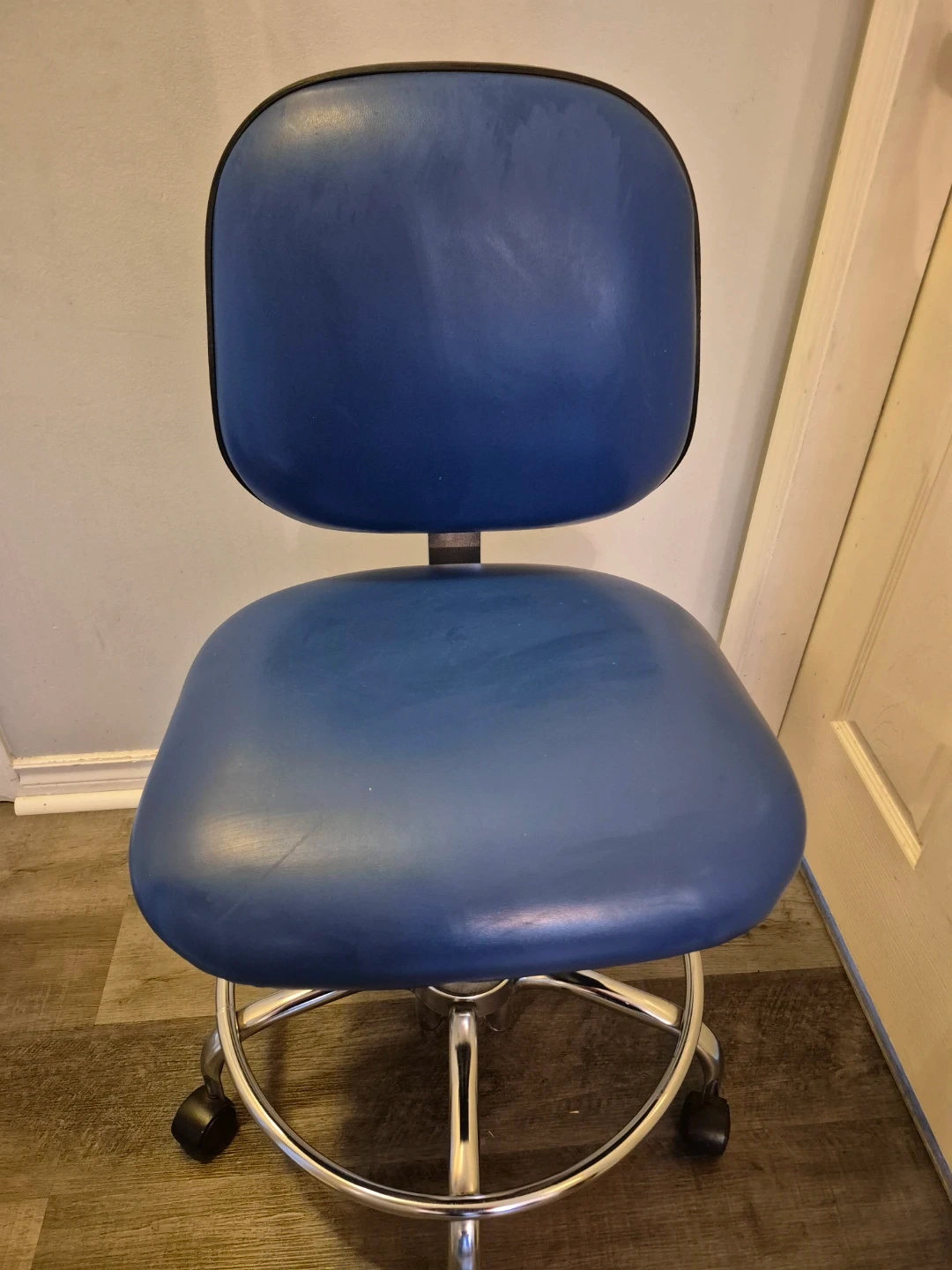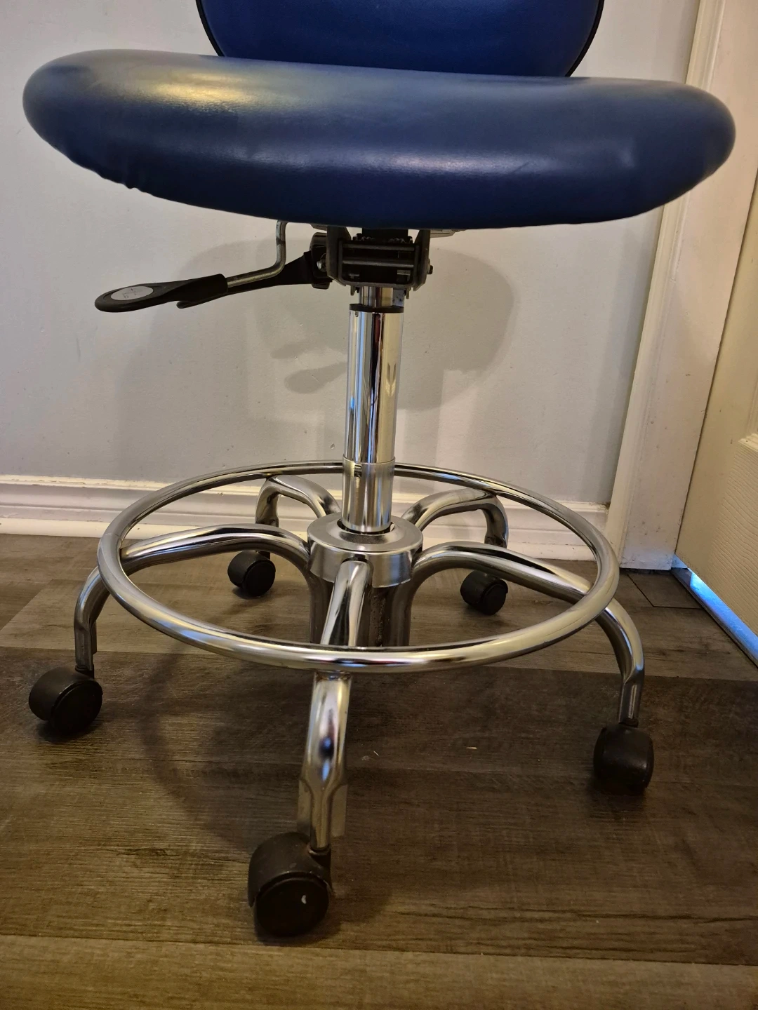 This is a blue rolling stool chair with a backrest and chrome base. It features adjustable height for comfortable use. The wheels allow for easy mobility around your workspace.
