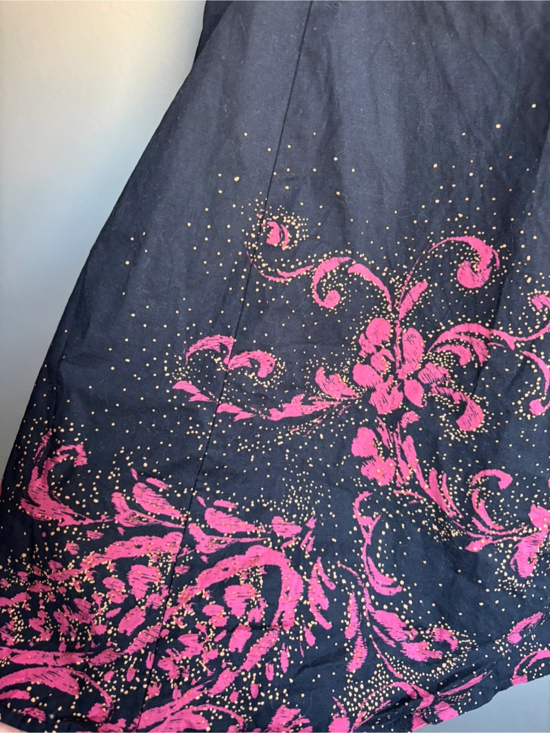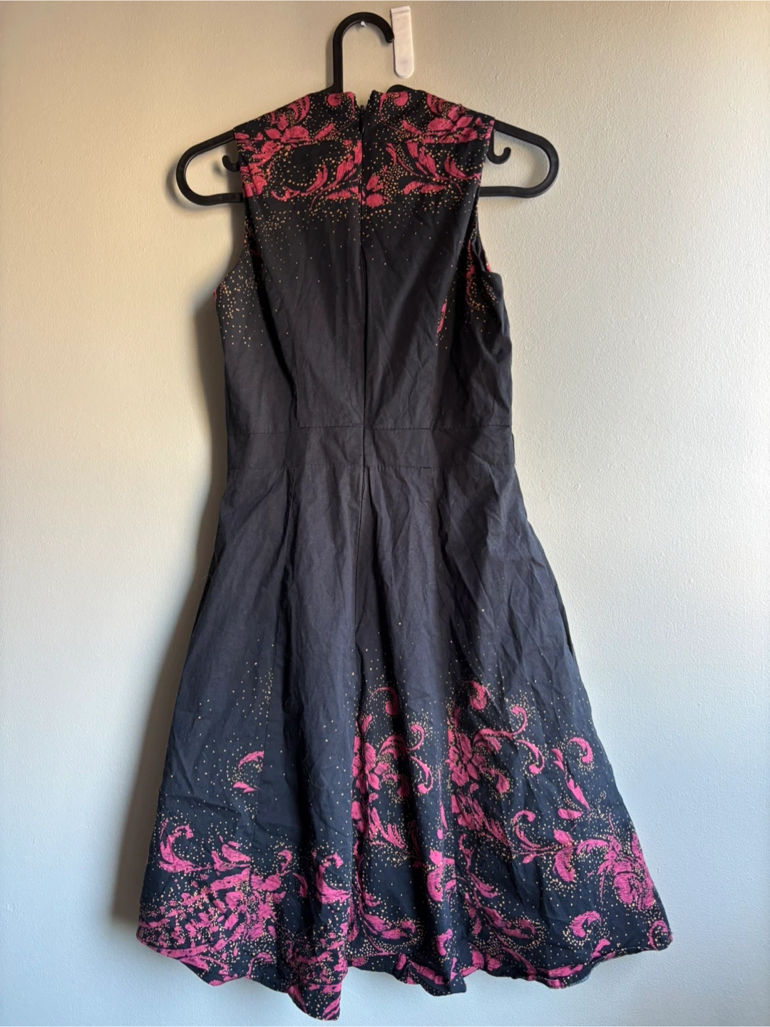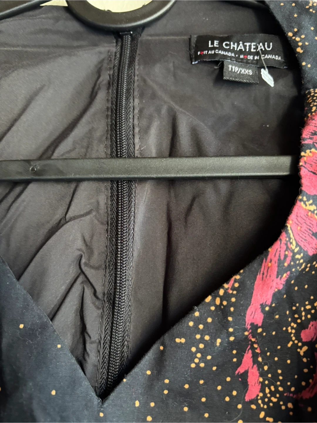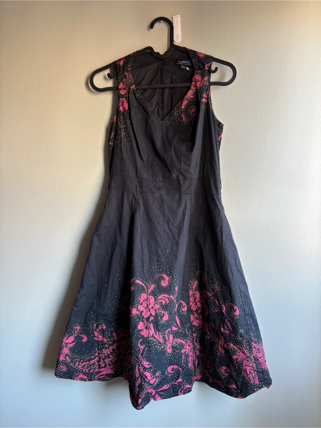 This LE CHÂTEAU sleeveless dress features a black base with a vibrant pink and gold floral print. Made in Canada, it's designed with a flattering silhouette and a zip closure at the back. A stylish option for various occasions!