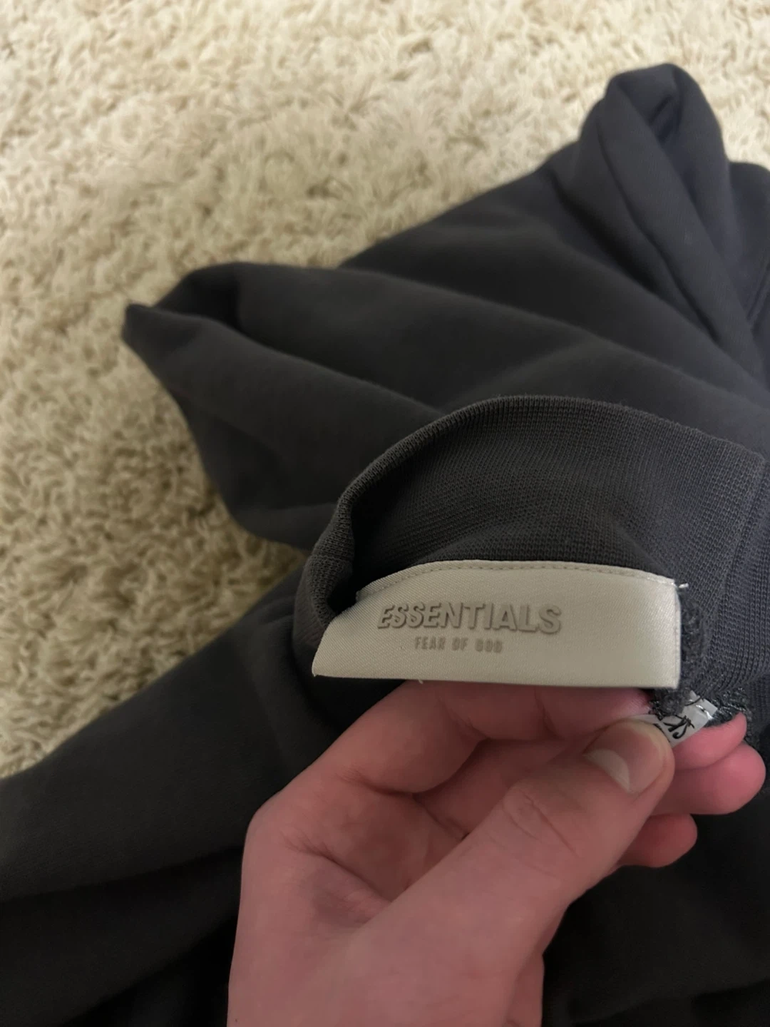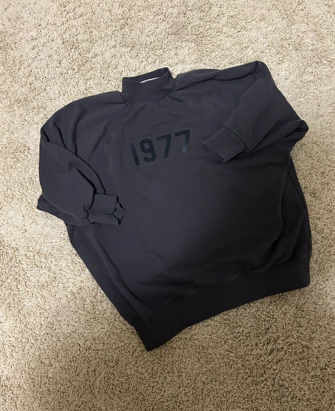 This Fear of God Essentials sweatshirt features a mock neck and "1977" graphic. It's made from 100% cotton. Size XS.
