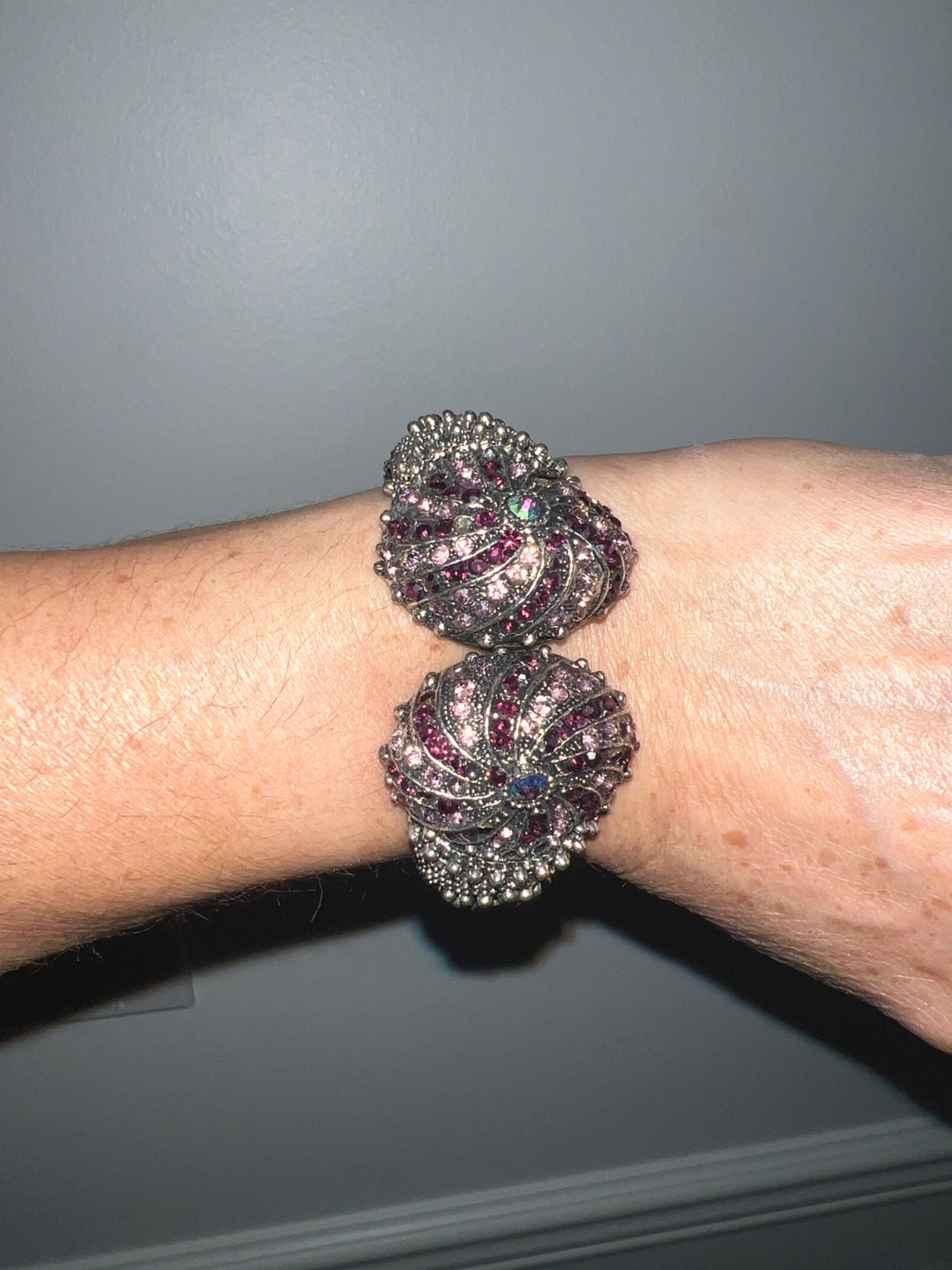 This is a beautiful silver bracelet with purple rhinestones. It is adjustable and would make a great gift.