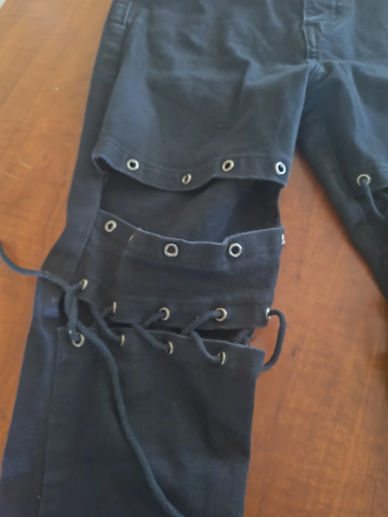 Selling a pair of Fashion Nova black jeans in size 3. They have a unique design with laced detailing on the legs. The material is a blend of rayon/elastane, making them comfortable and stretchy. Perfect for adding a bit of edge to your outfit! one lace got lost, but can easily be replaced by Hoodie strings.